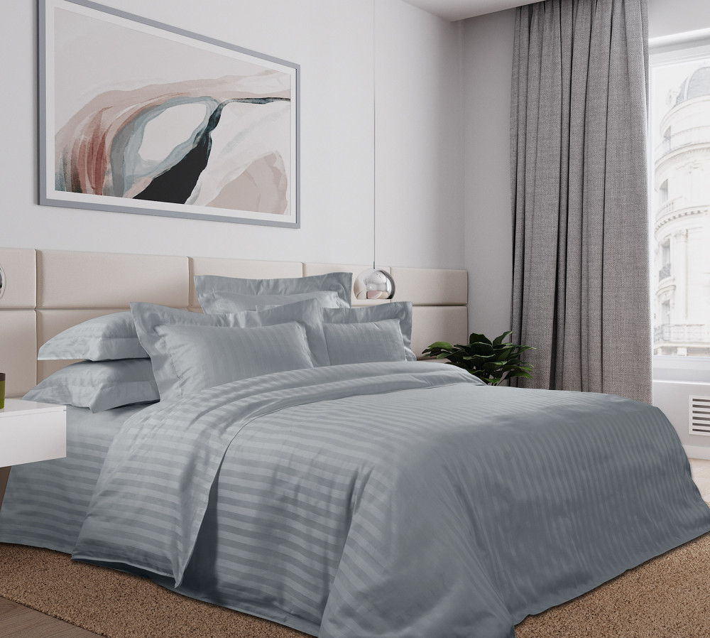 Страйп-сатин — это хлопковая ткань в однотонным цвете и полосками выполненными не красителями, а посредством жаккардового переплетения нитей. Полоски меняют оттенок цвета в зависимости от направления освещения. Ширина полоски — 2 сантиметра. Ткань имеет антипилинговую обработку, мерсеризацию. Технология производства — Air-Jet с конструкцией нитей 60×40. В данном пододеяльнике застежка — молния. Пододеяльник, идеально подходящих для использования в самых разных учреждениях — от элитных отелей до уютных детских садов.