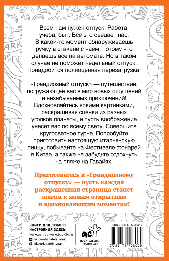 Серия: Для шибко умных Всем нам нужен отпуск. Работа, учеба, быт. Все это съедает нас. В какой-то момент обнаруживаешь ручку в стакане с чаем, потому что делаешь все на автомате. Но в таком случае не поможет недельный отпуск. Понадобится полноценная перезагрузка! «Грандиозный отпуск» — путешествие, погружающее вас в мир новых ощущений и незабываемых приключений! Вдохновляйтесь яркими картинками, раскрашивая сценки из разных уголков планеты, и пусть воображение унесет вас по всему свету. Совершите кругосветное турне. Попробуйте приготовить настоящую итальянскую пиццу, побывайте на Фестивале фонарей в Китае, а также не забудьте отдохнуть на пляже на Гавайях. Приготовьтесь к «Грандиозному отпуску» — пусть каждая раскрашенная страница станет шагом к новым открытиям и вдохновляющим моментам! |
