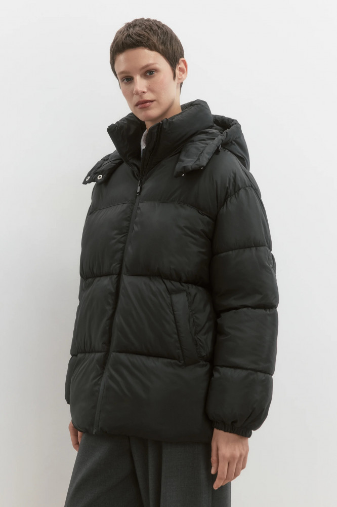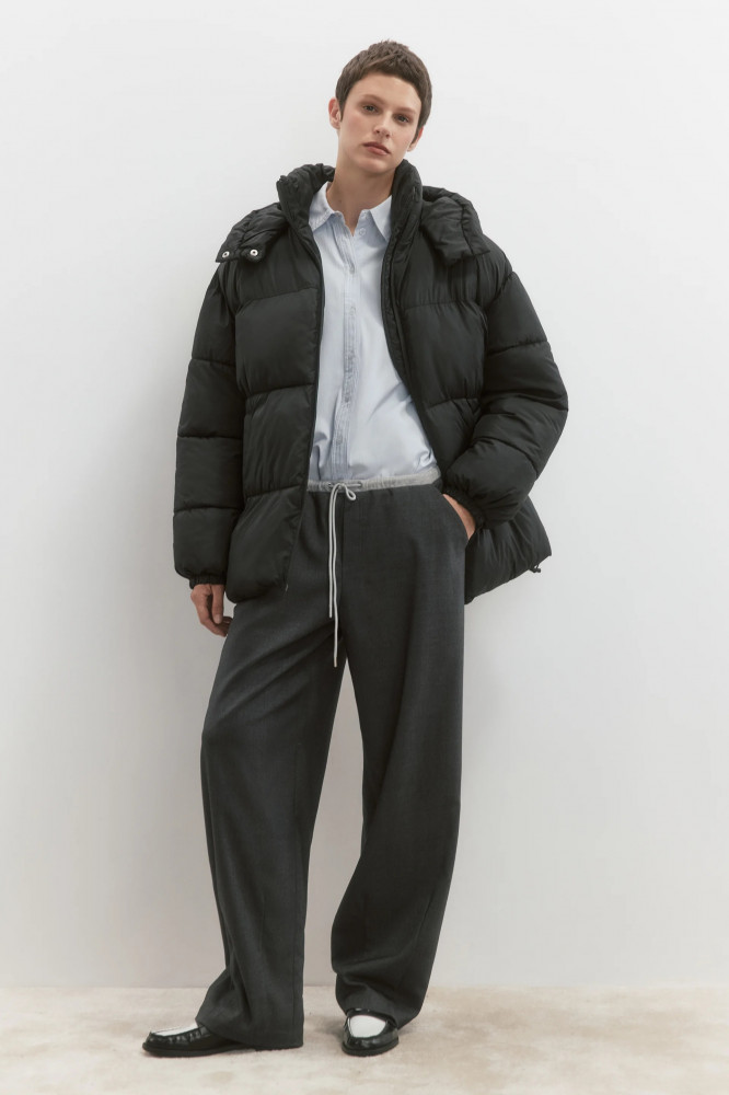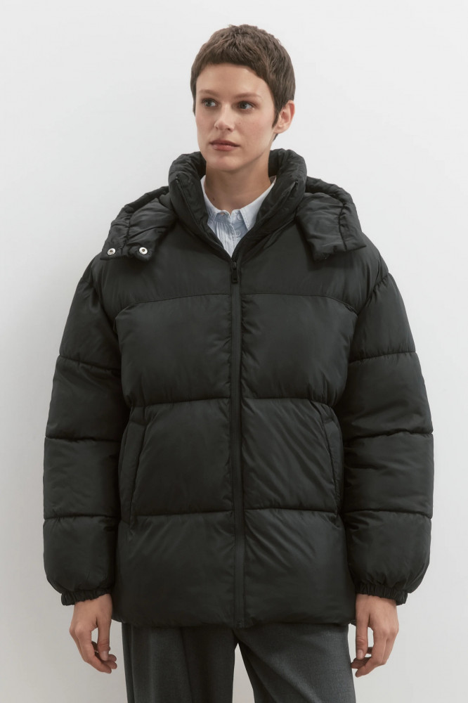 Стеганая женская куртка свободного кроя из гладкой ветроотталкивающей ткани с плащевой фактурой с легким искусственным утеплителем (синтепух). Высокий воротник-стойка и несъемный капюшон с утяжками на стопперах и с застежкой на кнопки. Длинные свободные рукава с присборенными манжетами и спущенной линией плеча. Застежка на молнию. Два прорезных боковых кармана без застежки. Прямой нижний край с утяжками на стопперах по бокам. Базовый однотонный пуховик для стильных повседневных аутфитов. Легкий и стильный непродуваемый пуховик на зиму, который защитит тебя от самых злых ветров, морозов, снегопадов и других неожиданностей погоды. Универсальный и практичный зимний пуховик свободного кроя, под который можно надевать свои любимые утепленные вещи.