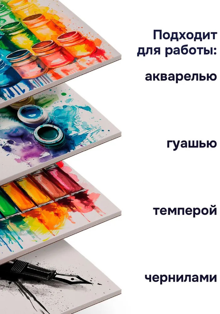 • универсальность: альбом подходит для работы с различными художественными материалами — акварель, гуашь, темпера и чернила.