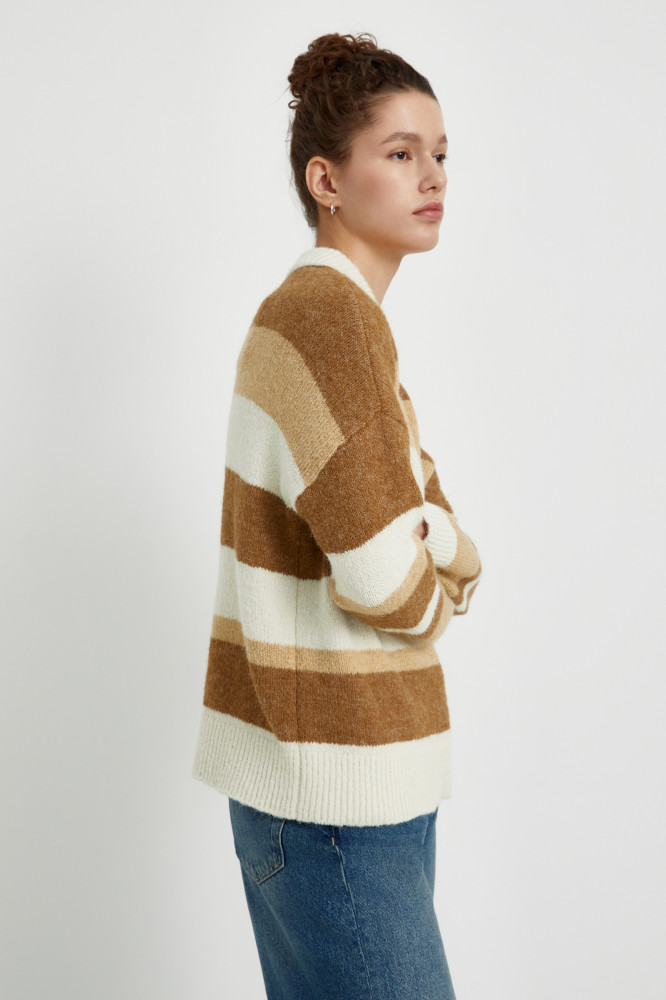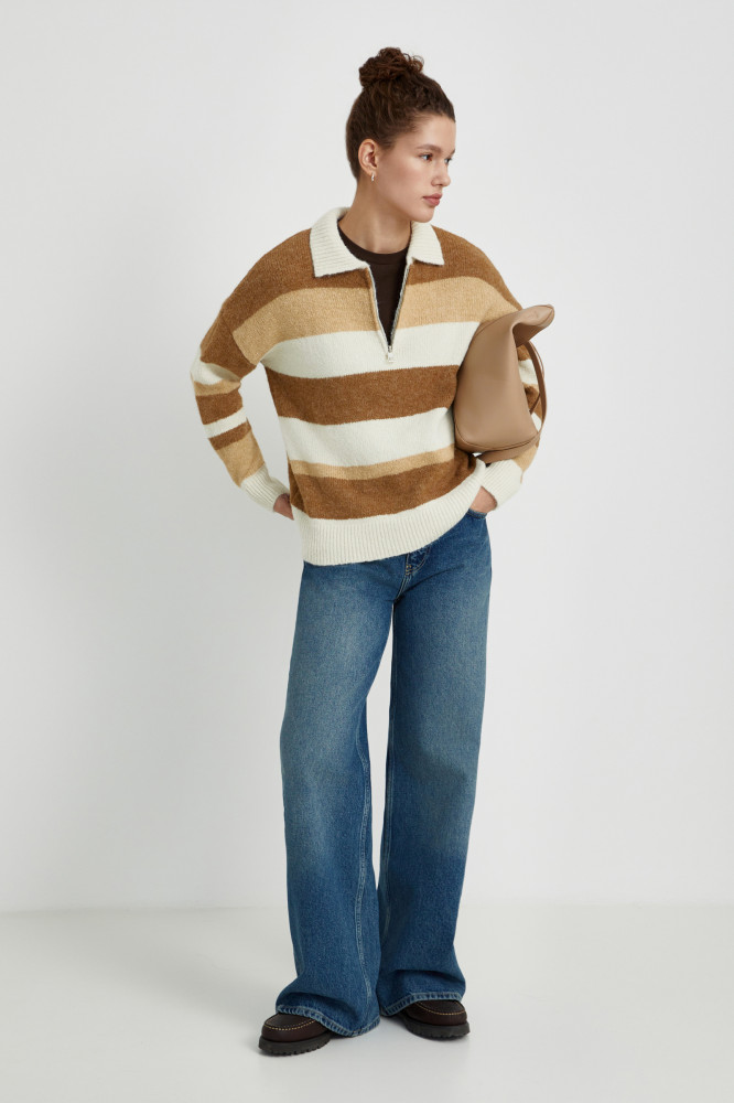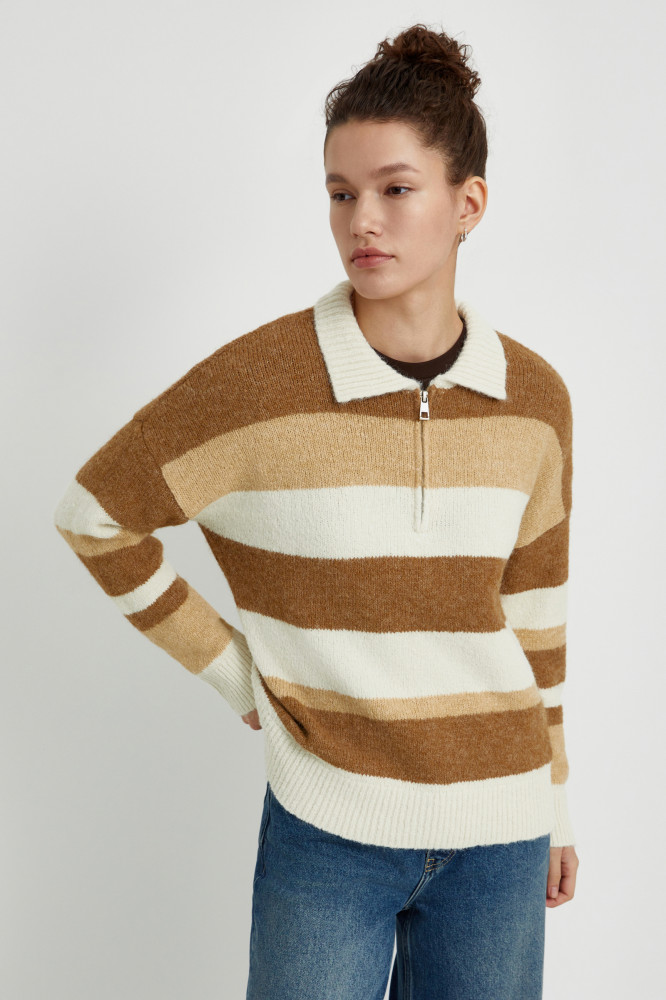 Джемпер с отложным воротником и молнией из пряжи с шерстью создан, чтобы подарить еще больше комфорта, нежности и мягкости. Уютный и теплый джемпер из тонкой пряжи — идеальный вариант для того, чтобы утеплиться перед морозной погодой. Натуральная шерсть в составе приятна на ощупь и отличается непревзойденной теплоизоляцией, воздухопроницаемостью и мягкостью. Полиэстер и нейлон гарантирует комфортную посадку по фигуре, а отложной воротник придаст образу классический и женственный вид. Трендовый принт добавит образу актуальности. Свободный силуэт гарантирует комфорт движений. А лаконичный дизайн модели легко сочетать с любым гардеробом.