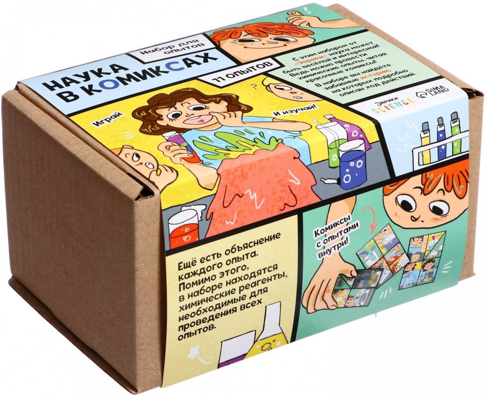 С набором для опытов «Наука в комисксах» ребёнок проведёт 11 увлекательных экспериментов и познакомится с удивительным миром химии и физики. В наборе вы найдёте забавные истории, на которых подробно описан ход действий. Отправляйтесь вперёд к научным открытиям вместе с героями комикса!
