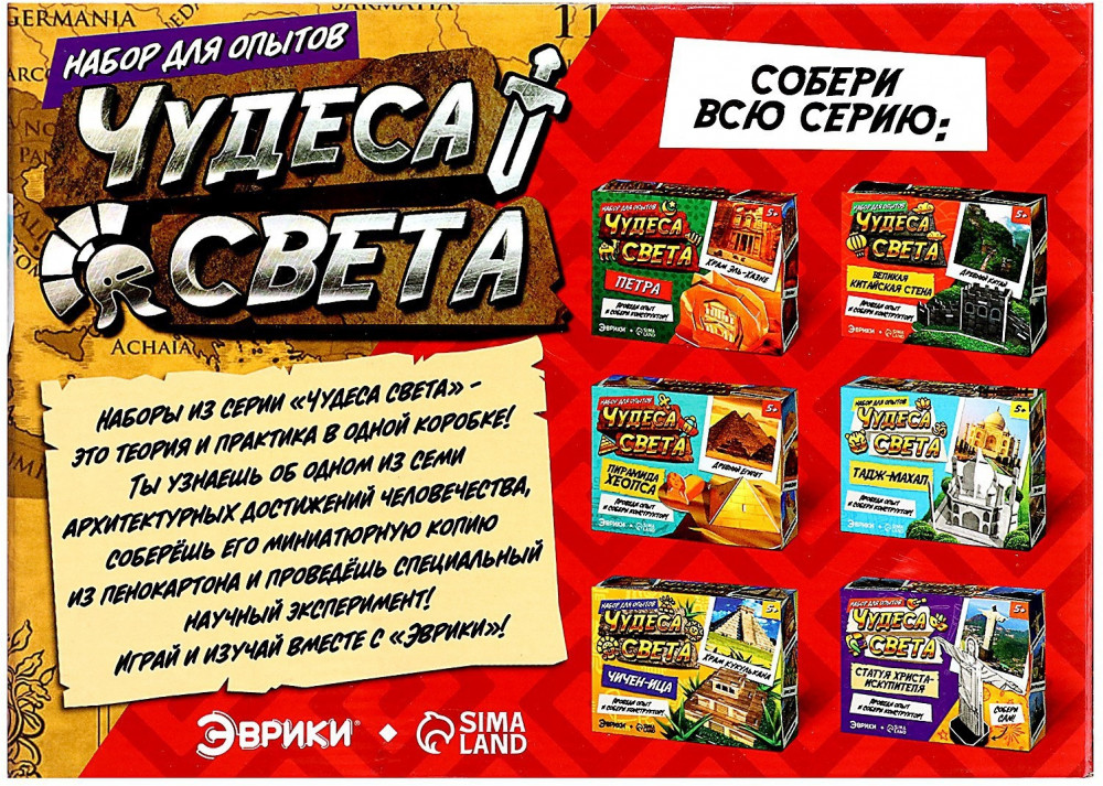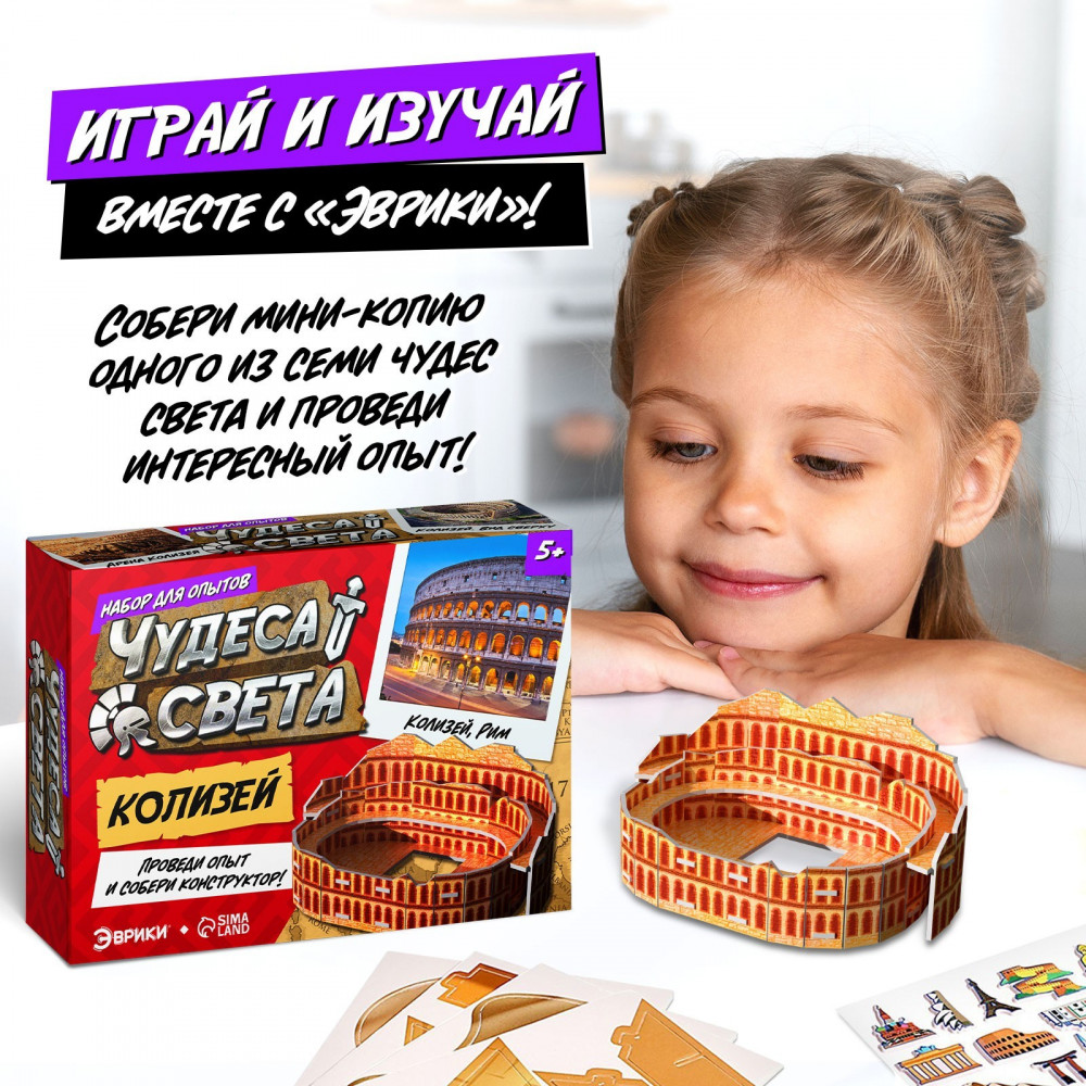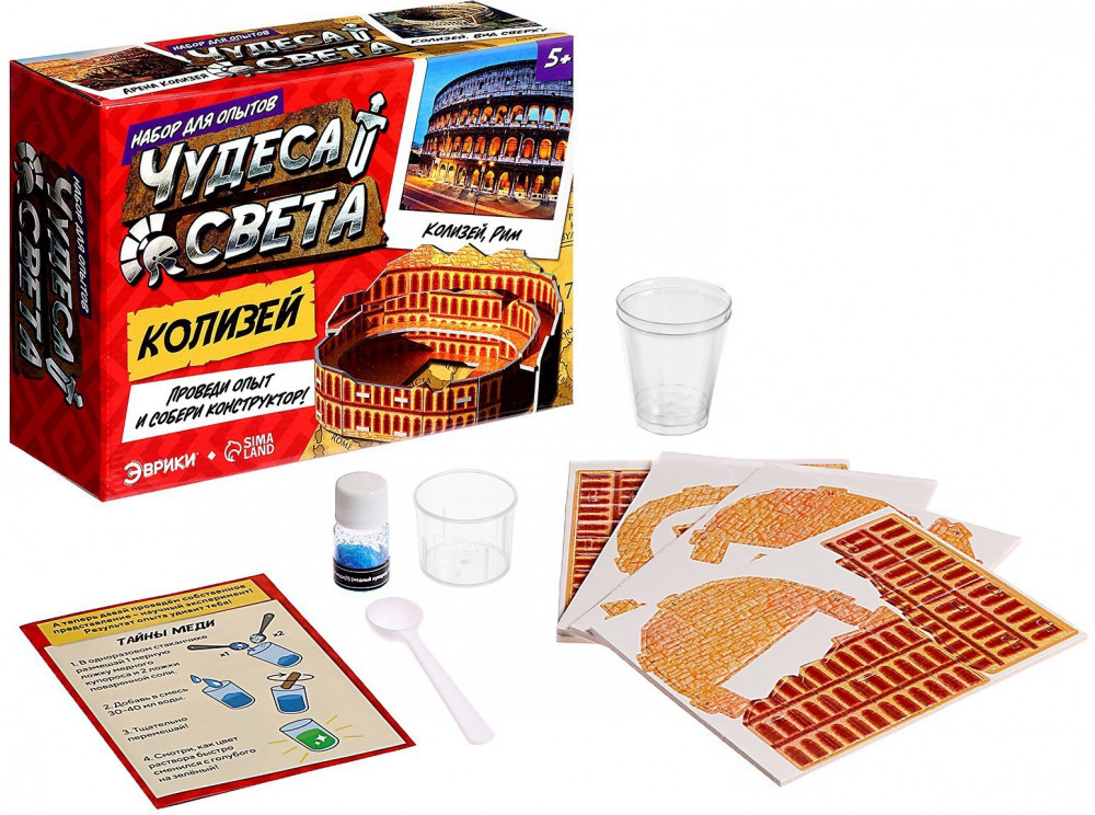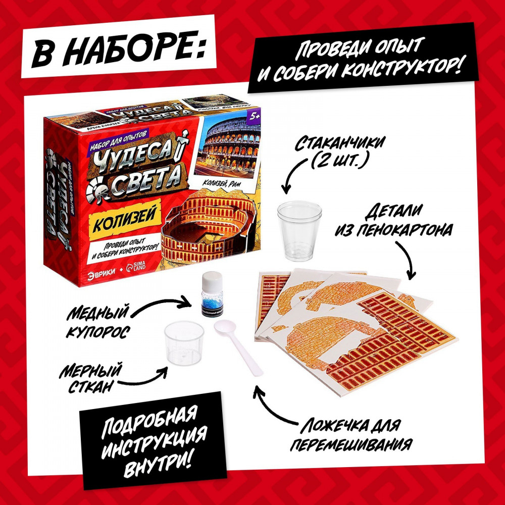 С набором для опытов «Чудеса света: Колизей» ребёнок своими руками соберёт модель известной итальянской арены, узнает о ней несколько интересных фактов, а также проведёт увлекательный опыт по химии и увидит, как взаимодействуют два вещества. Для сборки конструктора не понадобится клей. Чтобы собрать модель, следите за нумерацией: вставляйте детали друг в друга цифра к цифре.