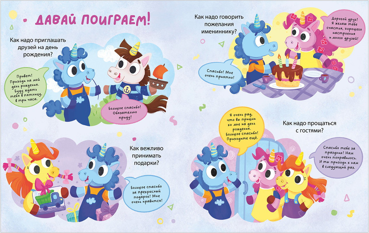Большая книга сказок про этикетВ данный момент этот товар отсутствует в продаже. Возможно, у нас найдется аналогичный или похожий товар здесь. Серия: Детский этикет в сказках «Большая книга сказок про этикет» — это сборник историй про милых единорогов Розочку, Лучию, Облачко и Шторма. Они ходят в гости, празднуют дни рождения, обедают за столом, учатся общаться, договариваться и дружить. Они не всегда знают, как правильно себя вести. Но вместе с маленькими читателями обязательно всему научатся. Автор сказок, педагог и самый читаемый в России детский писатель Елена Ульева знает, как объяснять детям важные вещи с помощью простых и понятных сказок, где милые герои попадают в знакомые каждому ребенку ситуации. Кто-то из единорожек качается на стуле за столом, а кто-то чавкает, кто-то не умеет разговаривать вежливо. Все они узнают, что такое этикет, какими бывают волшебные слова, как правильно общаться с друзьями. А вместе с ними воспитанными, вежливыми и отзывчивыми станут и маленькие читатели «Большой книги сказок про этикет». |