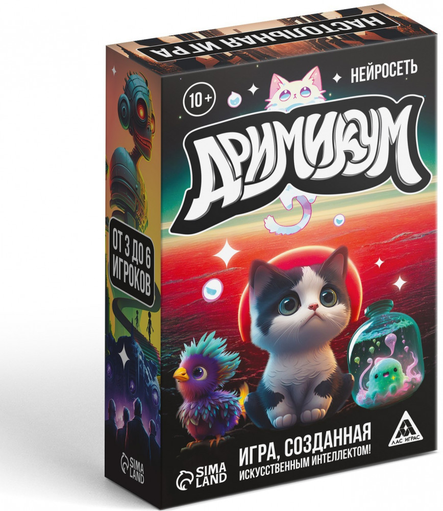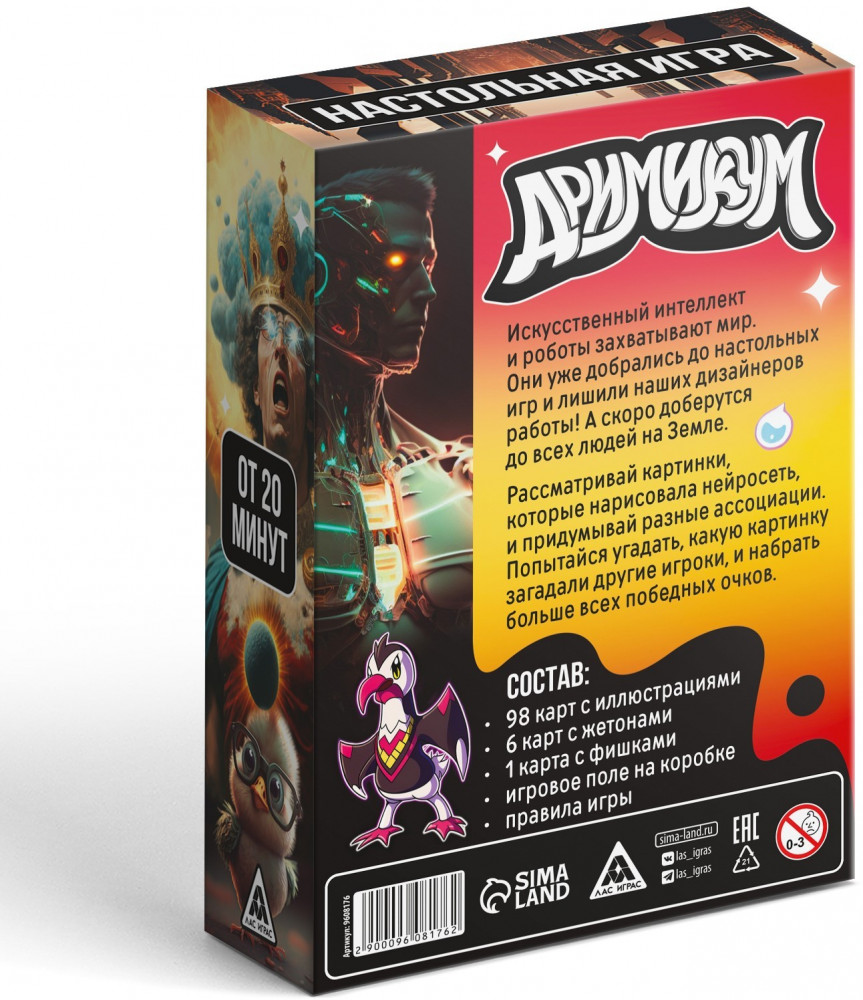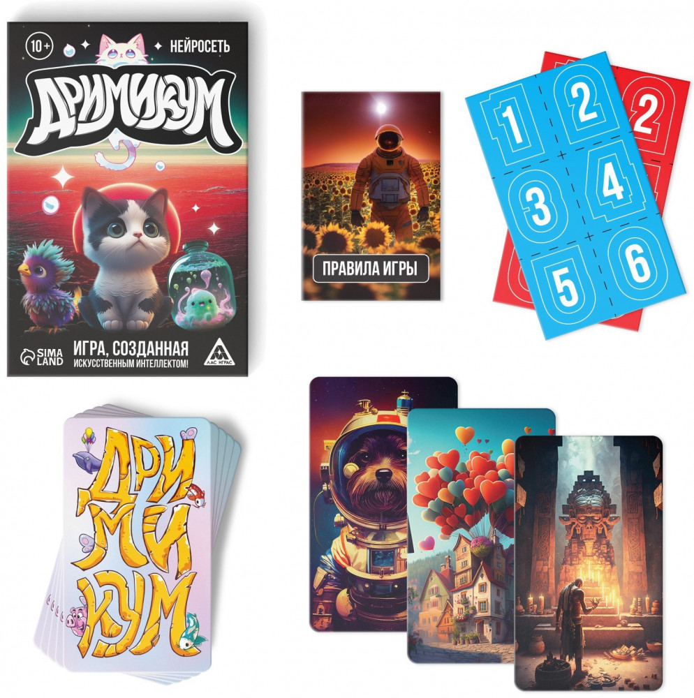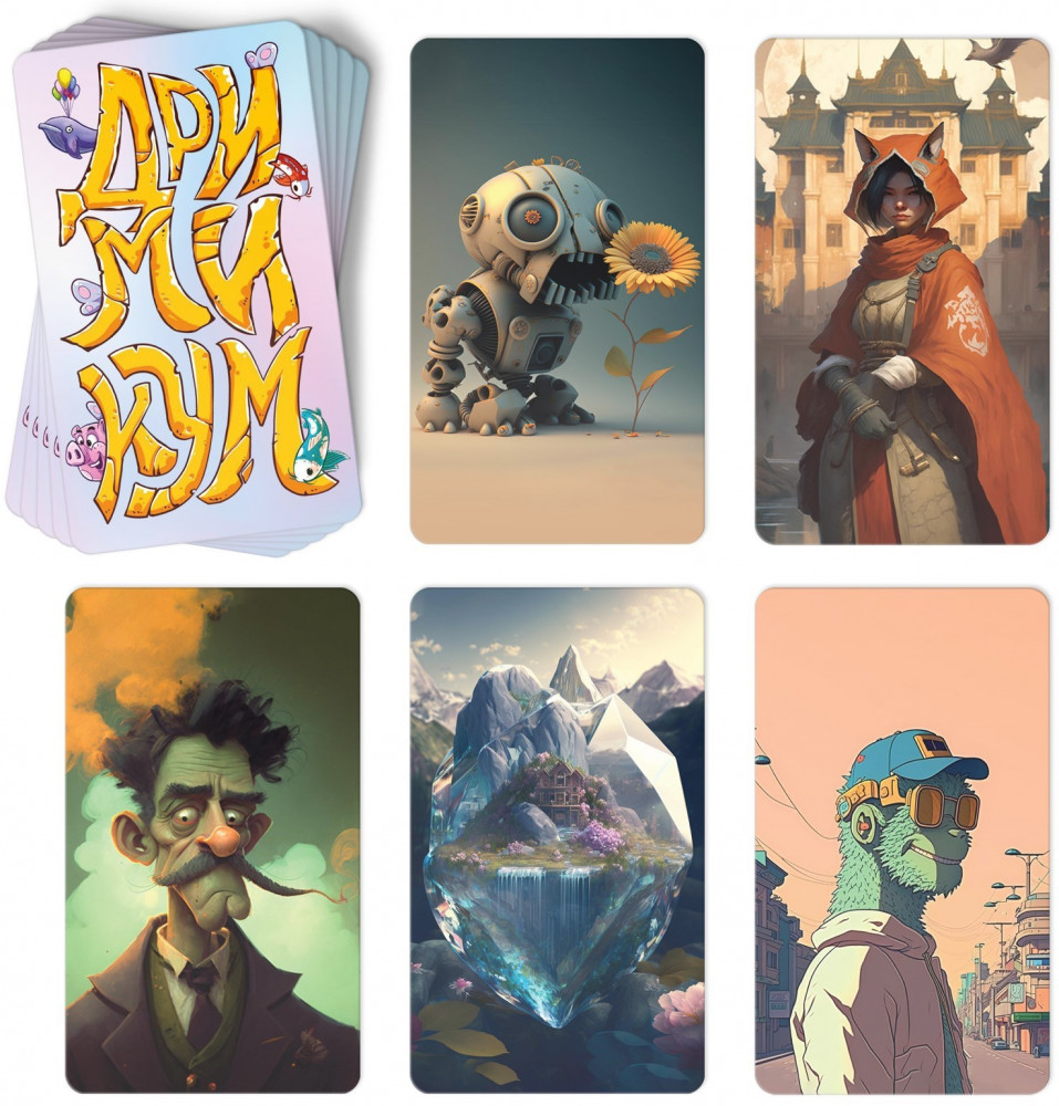 В данный момент этот товар отсутствует в продаже. Возможно, у нас найдется аналогичный или похожий товар здесь. Серия: Дримикум Искусственный интеллект и роботы захватывают мир. Они уже добрались до настольных игр и лишили наших дизайнеров работы! А скоро доберутся до всех людей на Земле. Рассматривай картинки, которые нарисовала нейросеть, и придумывай разные ассоциации. Попытайся угадать, какую картинку загадали другие игроки, и набрать больше всех победных очков.