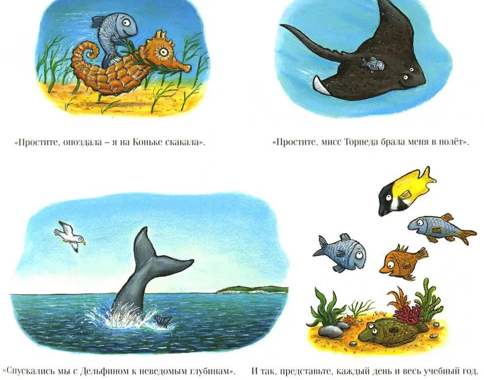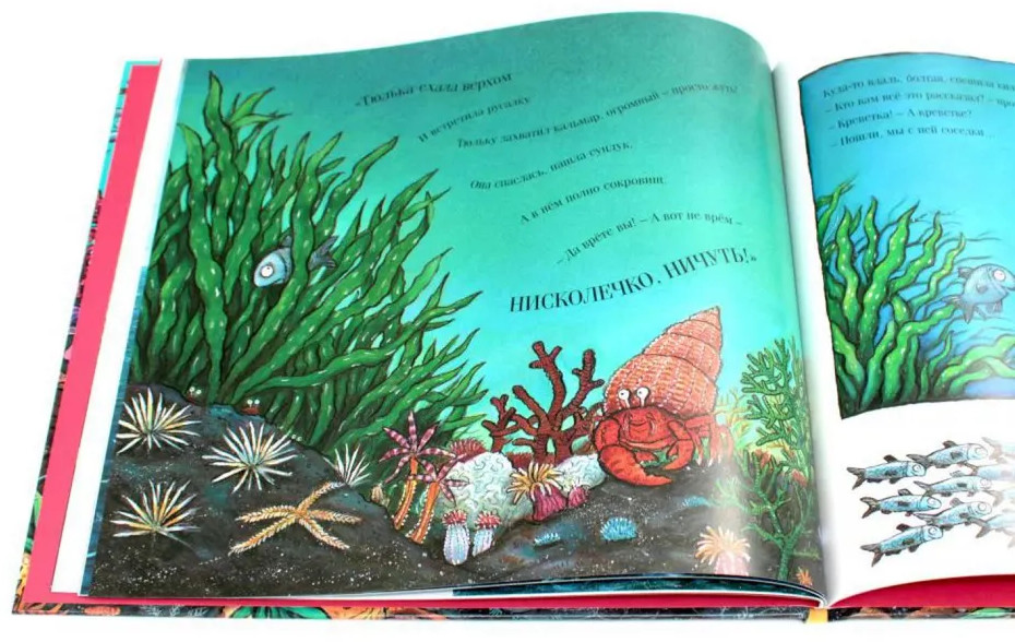 Жила на свете Тюлька, малюсенькая рыбка, простая рыбка в сером чешуйчатом пальто... Рыбка Тюлька каждое утро опаздывает в школу и всякий раз под новым предлогом: то она скакала на морском коньке, то каталась на скате, то нашла сундук сокровищ, то была в плену у гигантского кальмара. Никто не верит в Тюлькины истории, ведь всем известно, что маленькая Тюлька — большая выдумщица. Но однажды Тюлька, чудом спасшись из рыбацких сетей, заблудилась в океане. Помогут ли теперь Тюльке её «выдумки»? ...И верите ли вы им? |