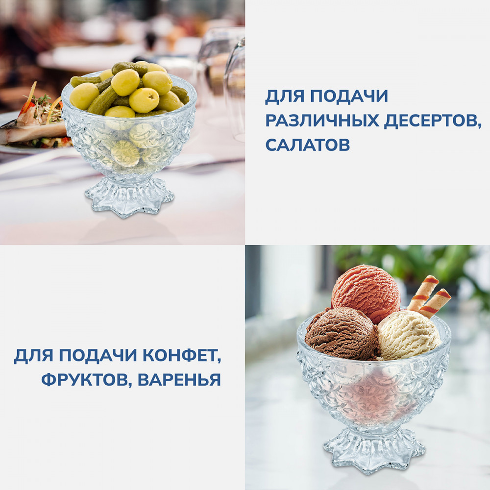 Креманка стеклянная на ножке из стекла — это универсальный и красивый предмет сервировки, обычно используемый для подачи мороженого и десертов. Креманка также используется как конфетница, салатник, соусник. |