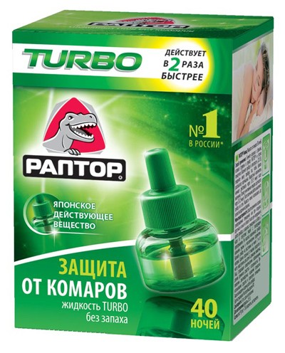 Применение: снимите колпачок с флакона, вставьте стержень в прибор Раптор Turbo и плотно прикрутите. Включите прибор в электросеть (220 В), повернув вилку прибора так, чтобы флакон располагался вертикально. Жидкостный наполнитель начинает действовать через 8-10 минут при включении кнопки «Turbo» или через 16-20 минут без включения кнопки «Turbo». При продолжительности работы 8 часов за ночь без использования кнопки «Turbo» флакон рассчитан на работу в течение 40 ночей, при использовании с включенной кнопкой «Turbo» — до 28 ночей. После окончания работы выключите прибор из сети. Жидкость можно использовать до полного испарения из флакона. |