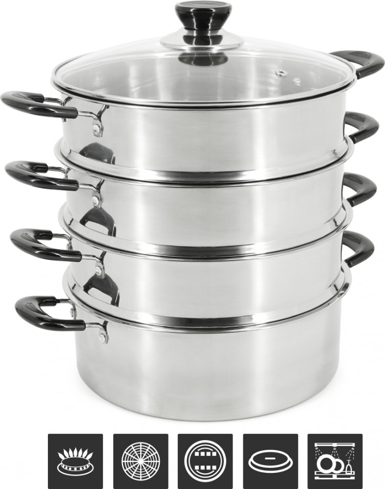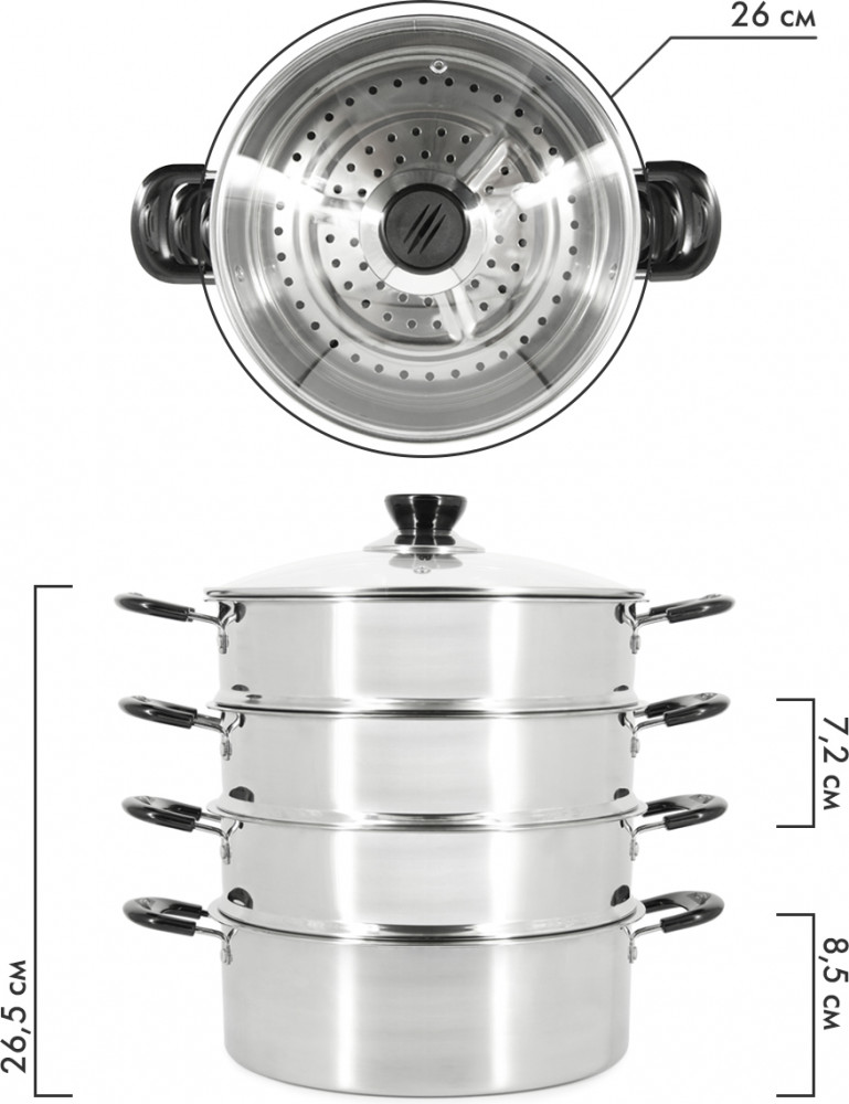 💳 Оплатить за товар можно при получении 🇰🇿 Есть бесплатная доставка по Казахстану 🎁 Копите бонусы с каждой покупки Мантоварка-пароварка Pomidoro со стеклянной крышкой. Диаметр 26см. 3 перфорированных яруса, высота 7см. Нижняя часть мантоварки может использоваться как кастрюля, объем 4,7 литра. Изготовлена из высококачественной нержавеющей стали. Безопасна для человека и не выделяет вредных веществ при повышенных температурах. Крышка изготовлена из термостойкого стекла с отверстием для выпуска пара. Ненагревающиеся бакелитовые ручки. Перед первым использованием тщательно вымойте посуду тёплой водой с использованием моющего средства. Вытрите насухо или полностью высушите. Для гарантированного сохранения блеска стали рекомендуется только ручное мытьё без использования абразивных средств и металлических мочалок. Подходит для всех типов плит, кроме индукционных. |