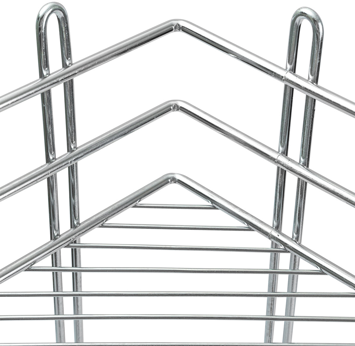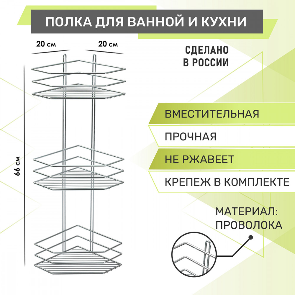 Полка для ванной трехъярусная угловая трапецевидной формы — надёжный и практичный аксессуар для ванной комнаты, идеально подходящий для хранения банных принадлежностей. Конструкция выполнена из стальной проволоки с гальваническим покрытием «блестящая оцинковка», что обеспечивает повышенную коррозионную стойкость и долговечность. Расстояние между ярусами — 270 мм, что позволяет удобно размещать предметы различной высоты. |