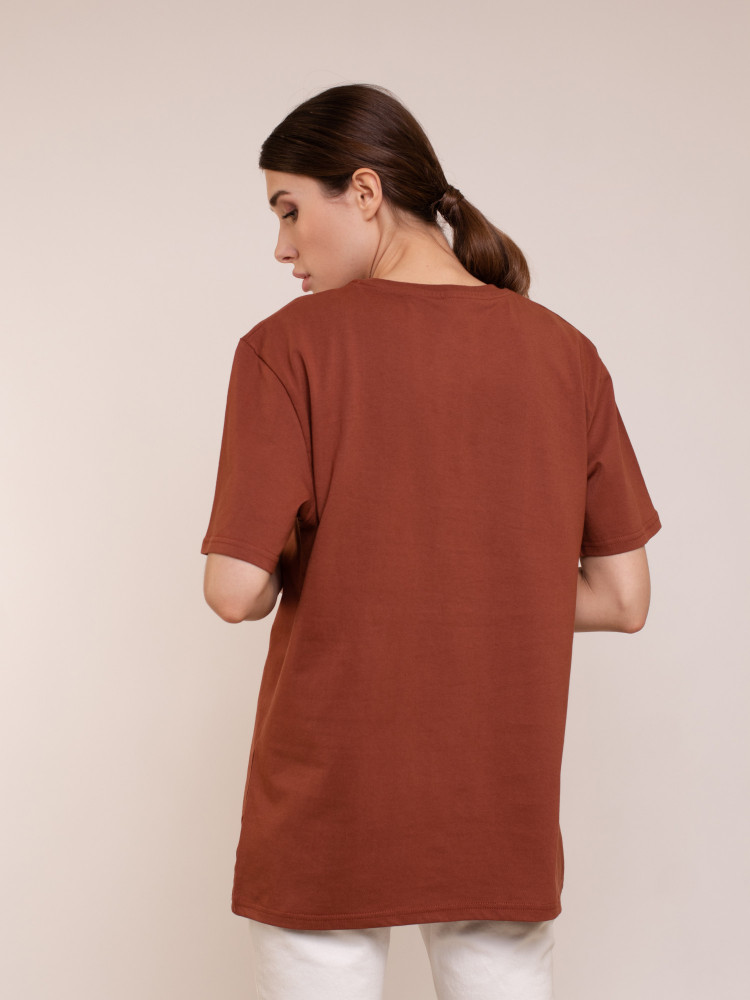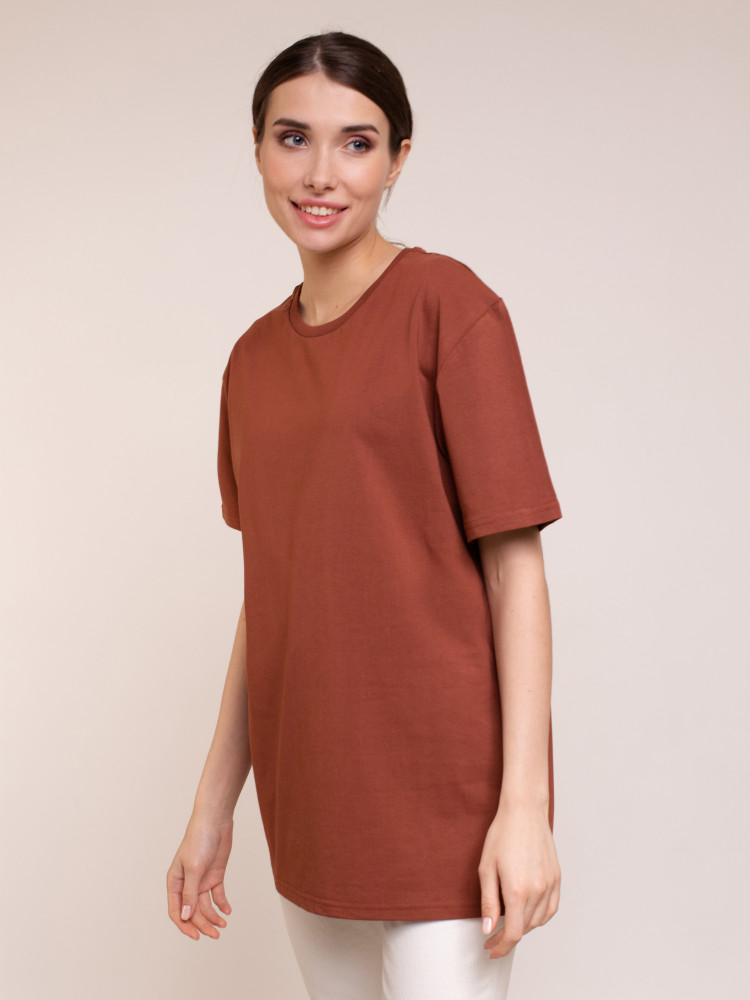 Футболка 48 размера, рост 164, на 50 размер рост 160 свободная. Очень хороший пошив, аккуратный, горловина обработана отлично. Ткань плотная, трикотажная, мало тянущаяся. Фасон прямой, со спущенным плечом. Цвет не такой яркий, как на фотографии сайта, он именно песочный.