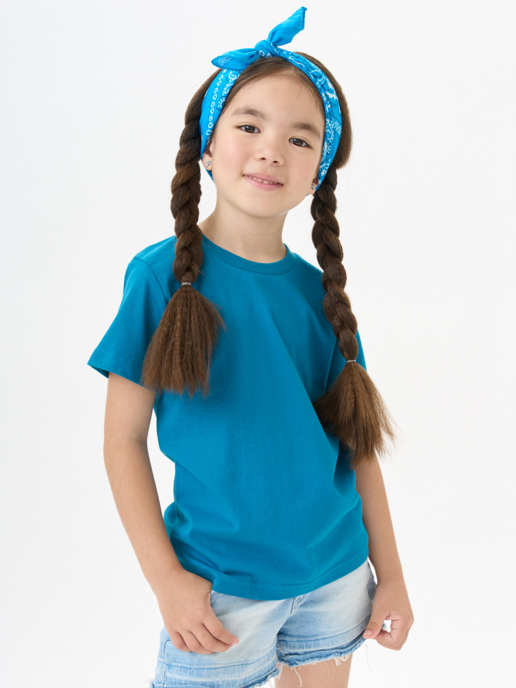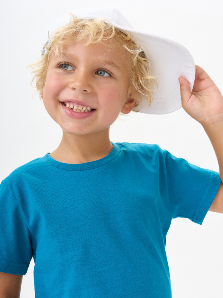 Футболка детская прямого покроя с втачными короткими рукавами. По линии горловины втачен ворот из ластичного полотна с 5% добавлением лайкры. Перед и спинка цельнокроеная. Плечевые швы обтачены бейкой из основного полотна, в край проложена отделочная строчка. Низ футболки и рукава подогнуты и подшиты на распошивальной машине. Ткань — кулирная гладь, из гребенной пряжи Ne 24/1, активное глубокое крашение.