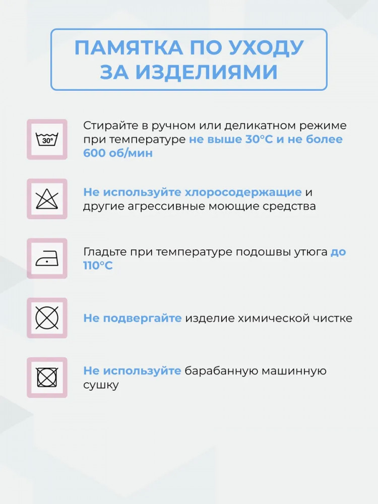 машинная стирка при температуре 30°С, без предварительного замачивания, не использовать машинную сушку