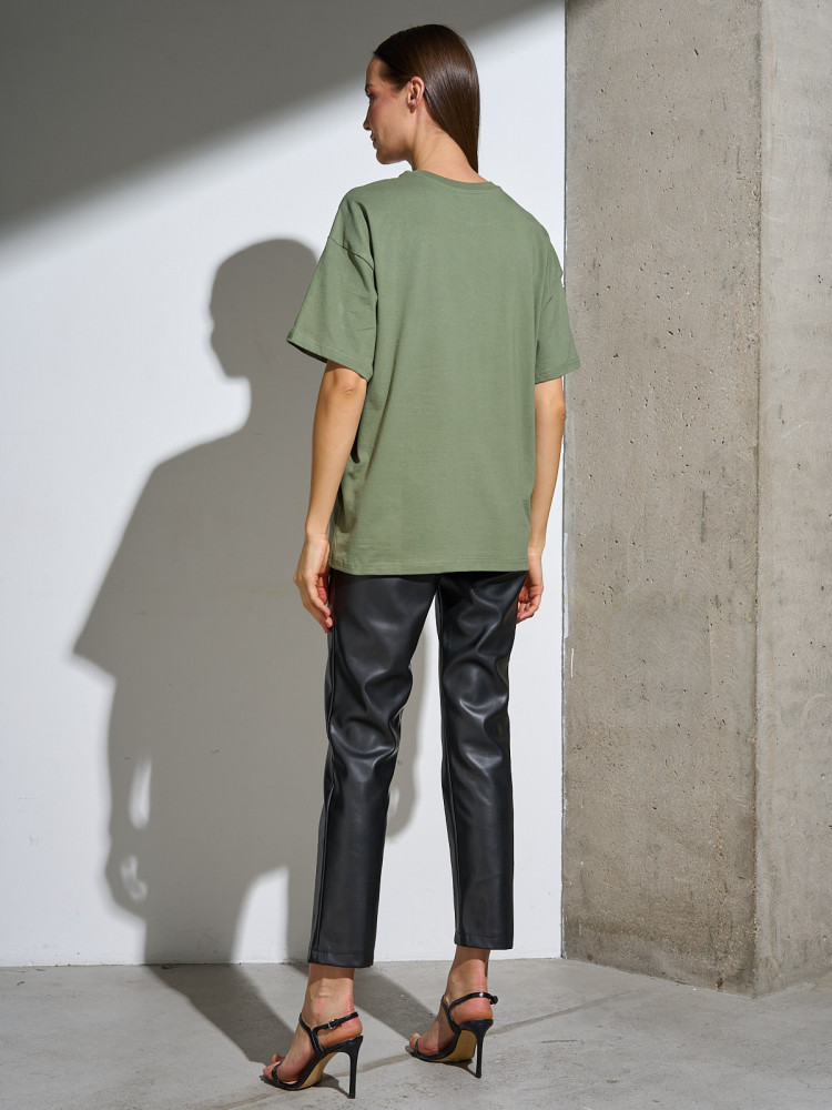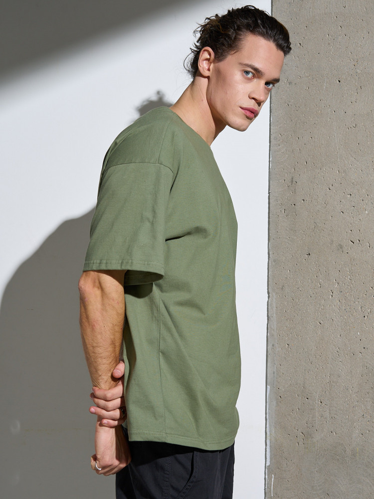 Футболка кроя оверсайз со пущенными втачными удлиненными короткими рукавами. По линии горловины обработан рибаной 1.5 см и втачен ворот из ластичного полотна с 5% добавлением лайкры. Низ футболки и рукава подогнуты и подшиты на распошивальной машине, ширина подгиба 2 см. Подходит для росписи акриловыми красками, нанесения принтов любым методом, для окрашивания тай дай. Ткань — кулирная гладь, из гребенной пряжи Ne 24/1, активное глубокое крашение.