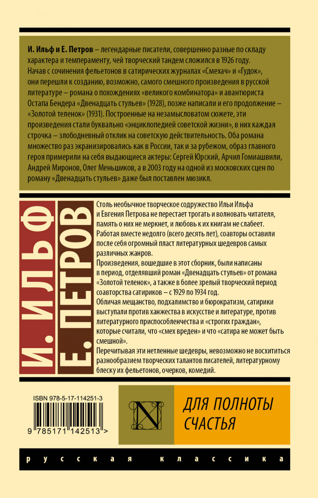 Серия: Эксклюзив: Русская классика Столь необычное творческое содружество Ильи Ильфа и Евгения Петрова не перестает трогать и волновать читателя, память о них не меркнет, и любовь к их книгам не слабеет. Работая вместе недолго (всего десять лет), соавторы оставили после себя огромный пласт литературных шедевров самых различных жанров. |