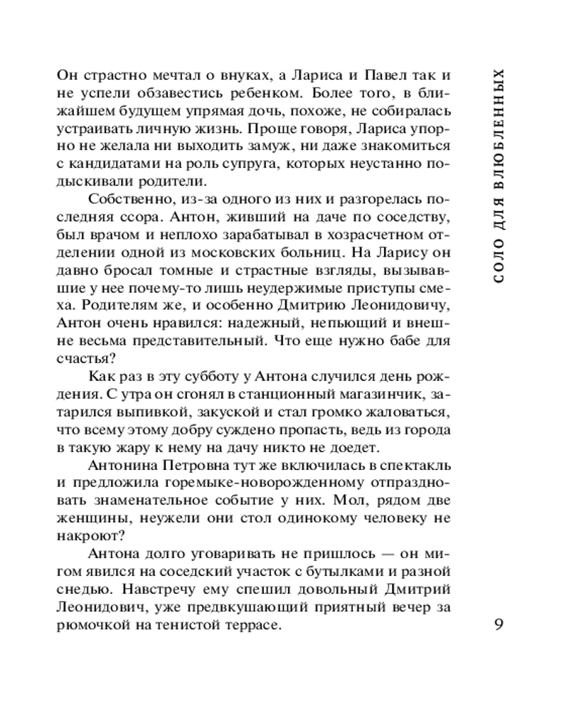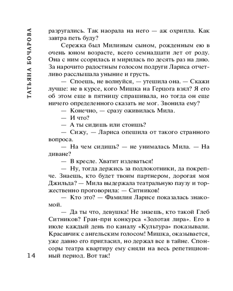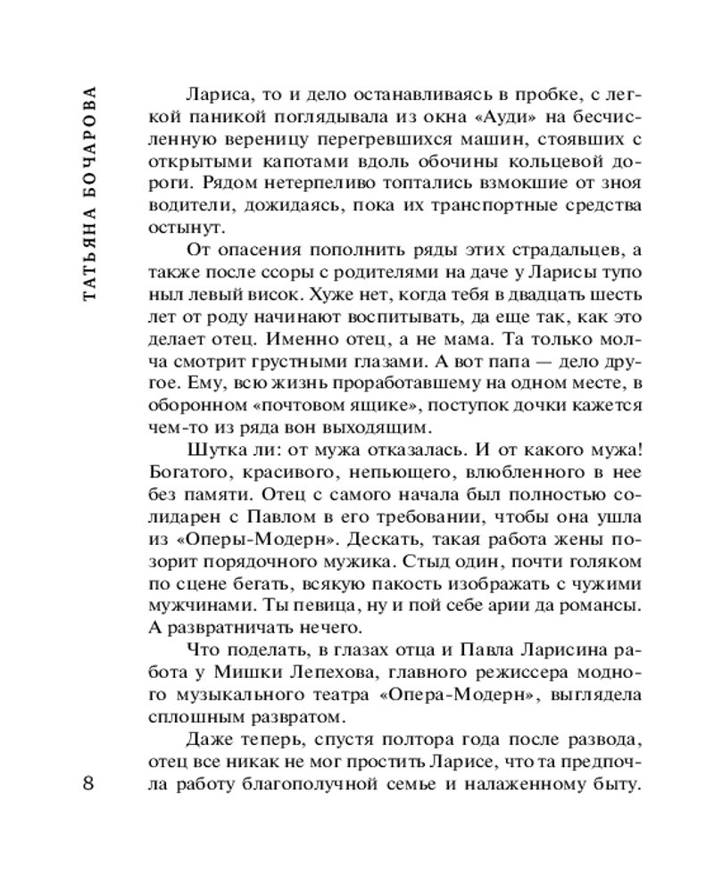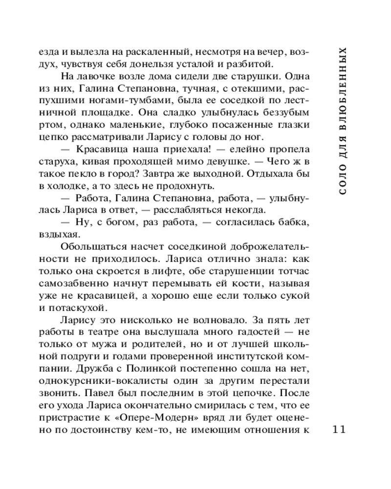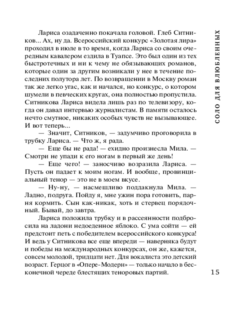 Соло для влюблённыхТатьяна Александровна Бочарова В данный момент этот товар отсутствует в продаже. Возможно, у нас найдется аналогичный или похожий товар здесь. Серия: Детектив сильных страстей. Романы Т. Бочаровой. Новое оформление (обложка) В жаркое августовское воскресенье молодая певица Лариса отправляется в театр на первую репетицию оперы Верди «Риголетто», где ей предназначена главная роль Джильды. Но по пути она становится единственным свидетелем ужасного ДТП — неизвестный насмерть сбил человека. Шокированная Лариса успевает запомнить несколько примет автомобиля: цвет, марку и, главное, талисман на лобовом стекле — краб малахитового цвета с красными глазами. Лицо водителя рассмотреть не удается — в момент аварии он упал лицом на руль, а в следующую секунду тронулся с места и исчез. Лариса с опозданием приезжает в театр, где знакомится с новым солистом Глебом Ситниковым и влюбляется в него буквально с первого взгляда! Но в его поведении она замечает некоторые странности, которые наводят ее на страшные подозрения... |