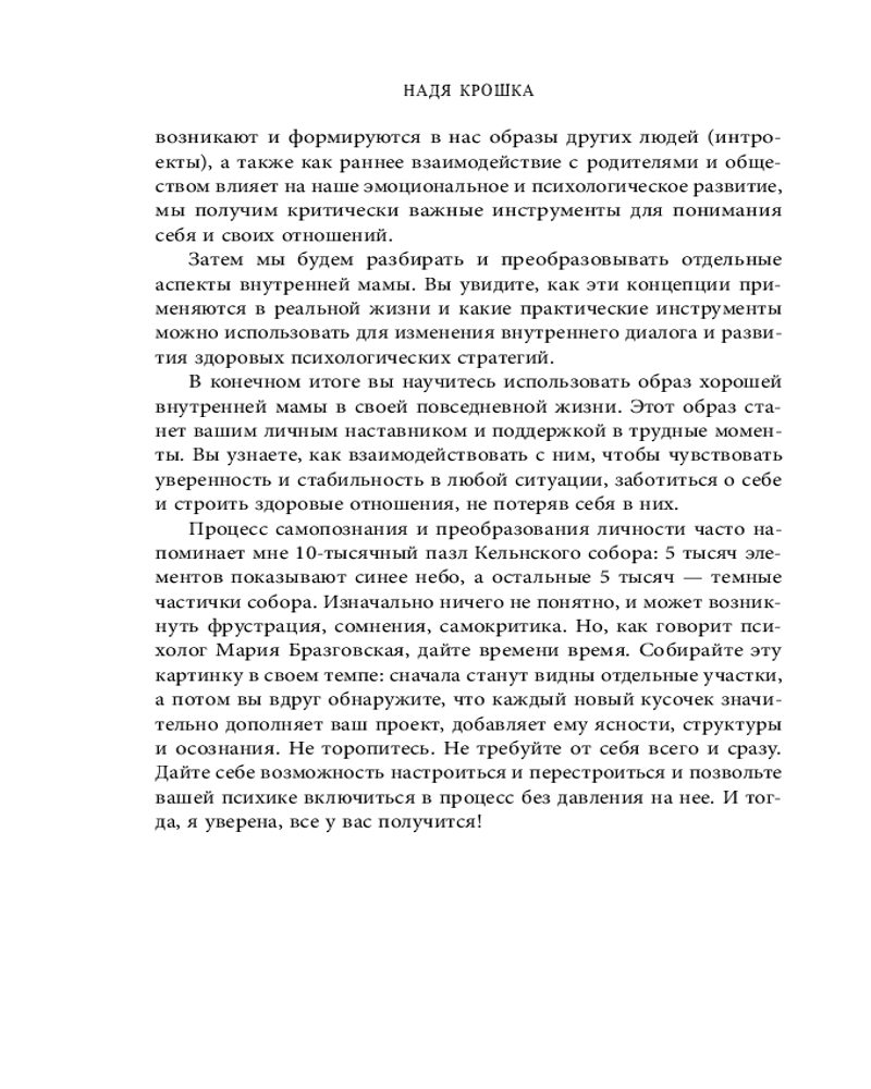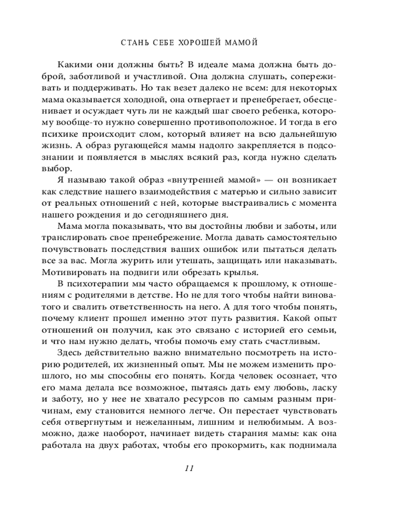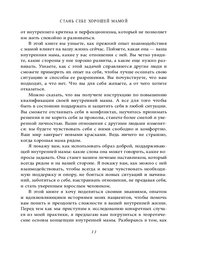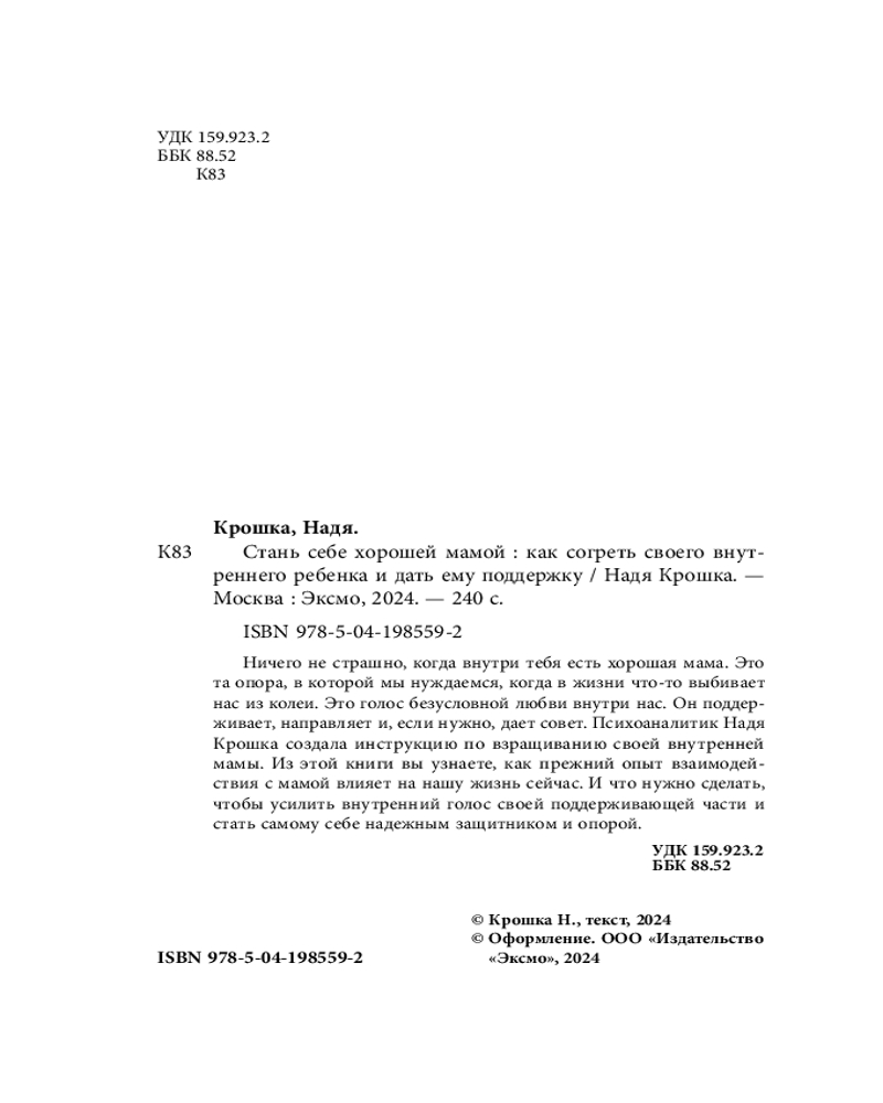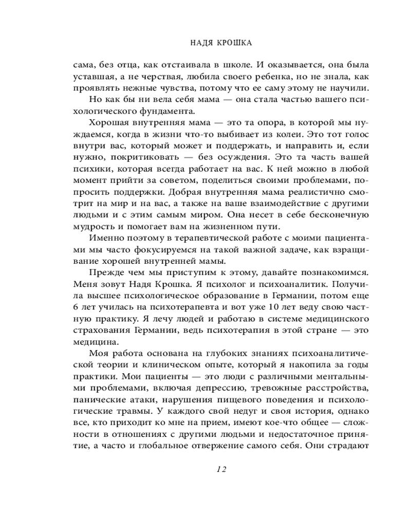 Стань себе хорошей мамой. Как согреть своего внутреннего ребёнка и дать ему поддержкуВ данный момент этот товар отсутствует в продаже. Возможно, у нас найдется аналогичный или похожий товар здесь. Серия: Top expert. Практичные книги для работы над собой Какой голос звучит у вас в голове, когда вы допускаете ошибки или терпите провалы? Осуждающий или поддерживающий? Если первый, то скорее всего именно так разговаривали с вами родители. Укоряли и стыдили, когда стоило утешать и подбадривать. Практикующий психотерапевт Надя Крошка предлагает перестать сожалеть о том, что мама или папа когда-то не сумели стать для вас-маленького надежной опорой, и не требовать от них этого сейчас, а взрастить внутри себя заботливого родителя. Научиться относиться к себе так, как должна была относиться хорошая мама. А это значит, перестать критиковать себя и игнорировать свои потребности. |
