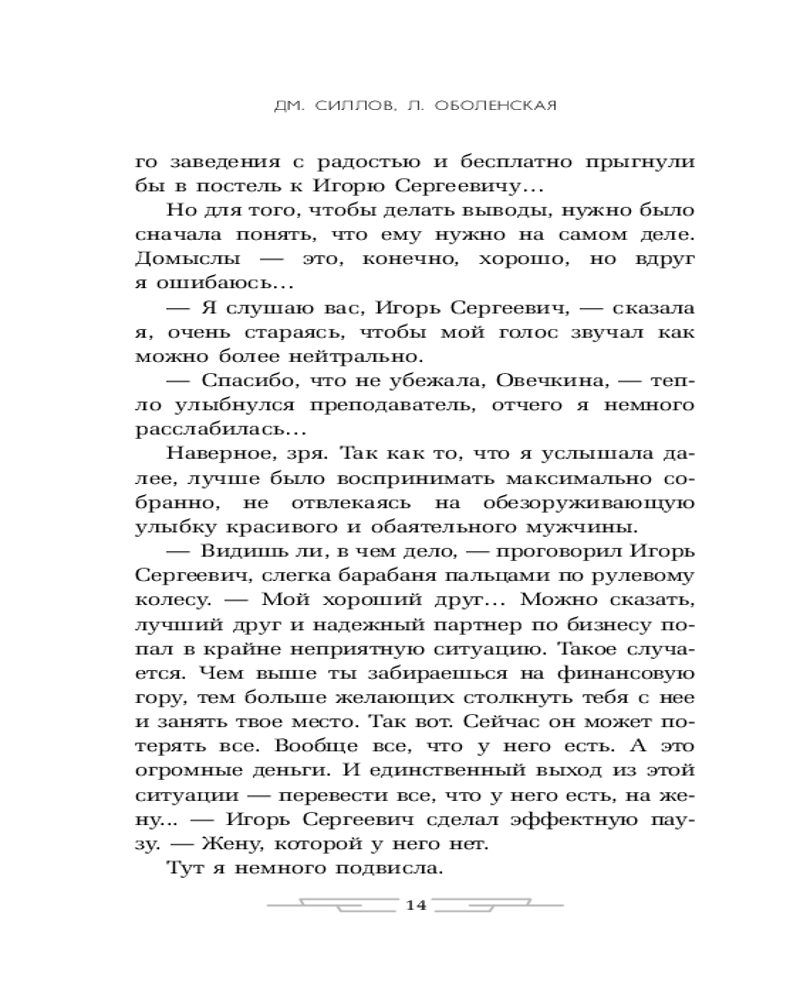 Серия: Звезды лирической прозы Когда тебе поступает предложение совершенно легально заработать большие деньги, отказываться от него неразумно. Подумаешь, выйти замуж — и фактически сразу развестись! На первый взгляд ничего сложного. Но кто бы мог подумать, чем обернется этот фиктивный брак... Один из соавторов этого творческого тандема, писатель Дмитрий Силлов, является автором четырех десятков бестселлеров для настоящих мужчин и идеалом защитника даже для сильных женщин. Работа в дуэте с Любовью Оболенской привнесла в их совместные романы пронзительную лирическую нотку. |