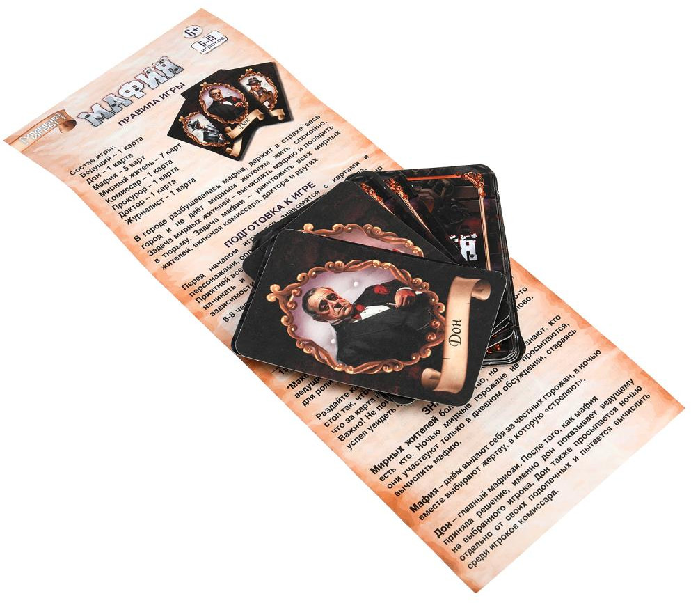 • 9-10 человек — ведущий, мафия (3 игрока), комиссар, доктор, мирные жители (3-4 карты);