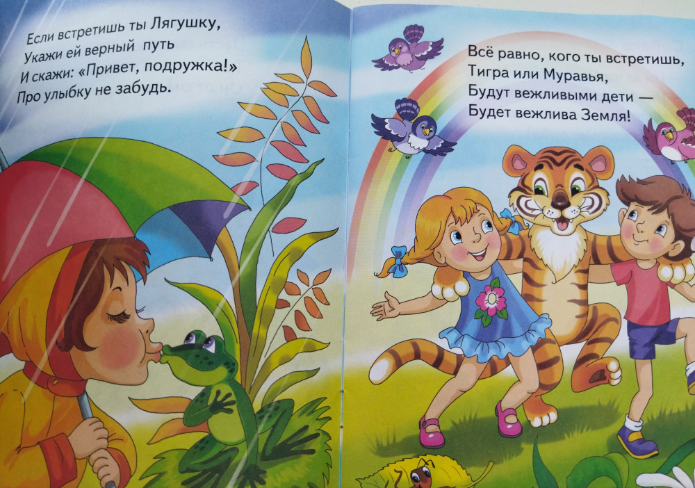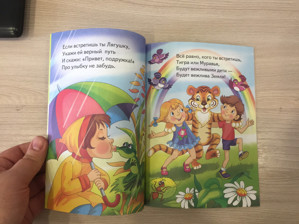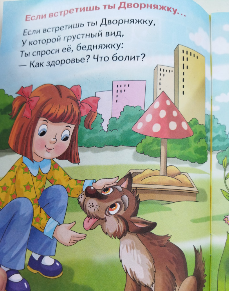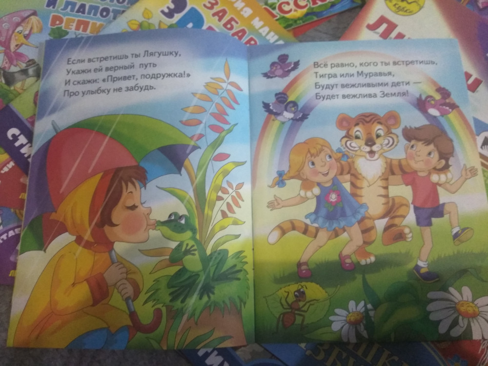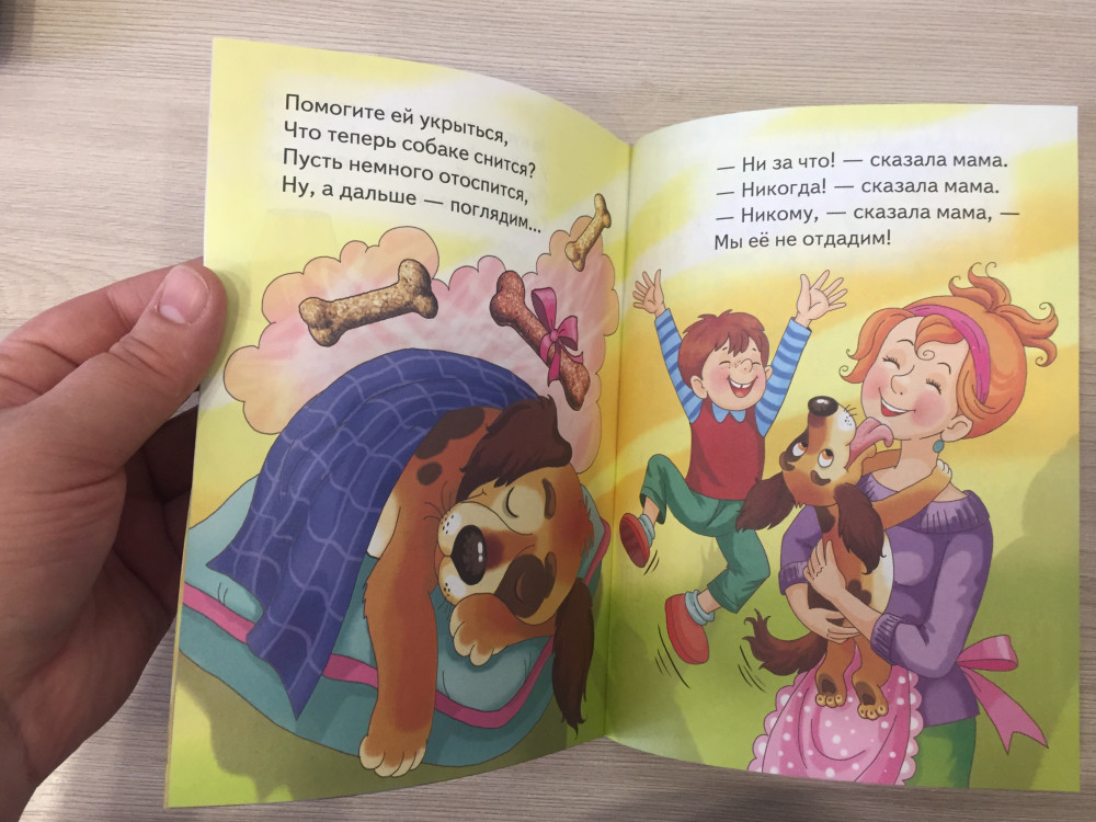 Купила всю серию книг. Книги обычного размера, листы тонкие, имеется запах краски. Иллюстрации яркие. В книге 2 стихотворения. Первый про то, кого встретишь, улыбнись ему, или поиграй, подари счастье. Второе про то, как мама не хотела заводить детям собаку. По потом, передумала и полюбила ее. Добрые и позитивные стихотворения. Понравилась