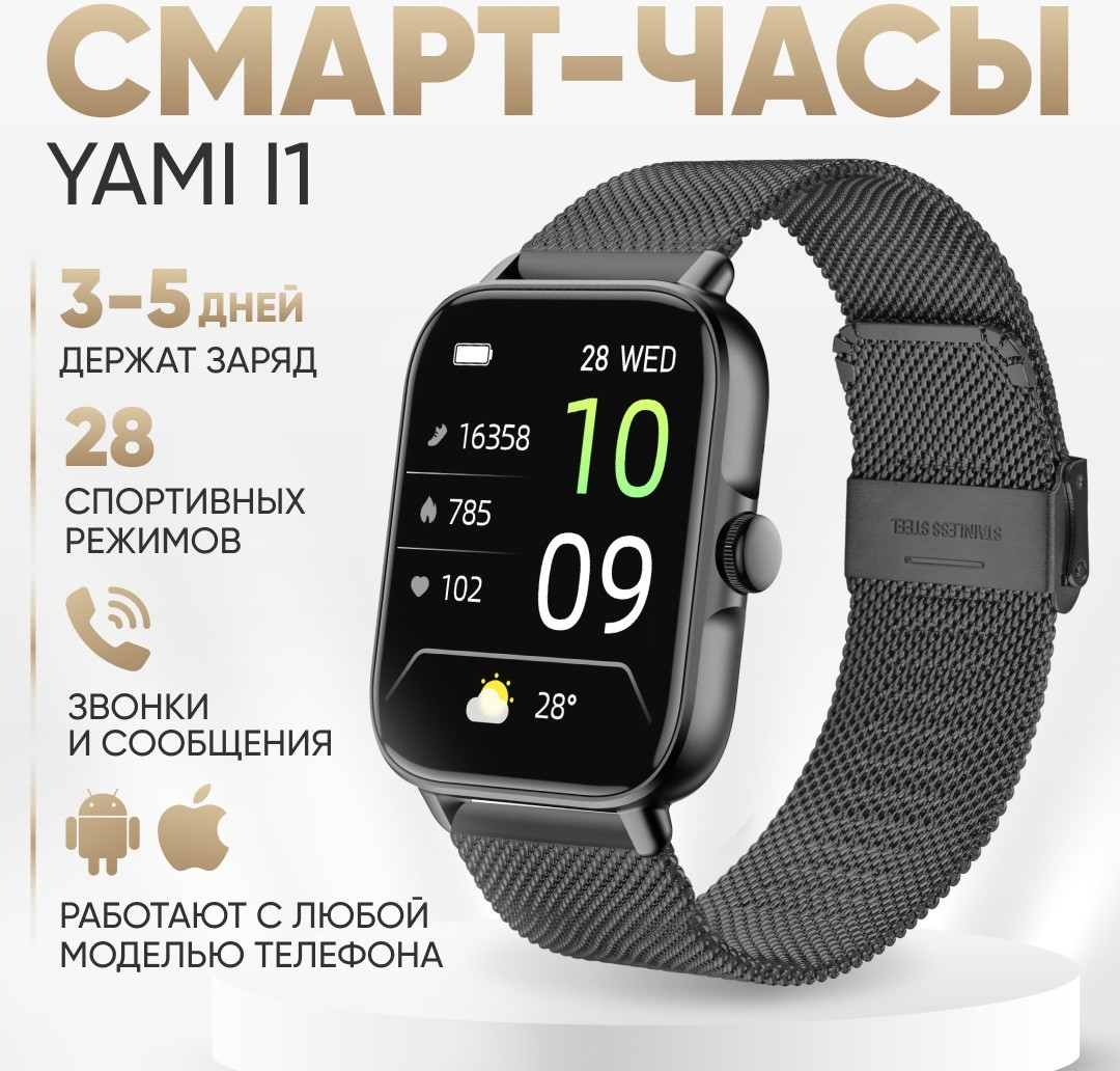 Смарт-часы YAMI i1 обеспечивают удобство в повседневной жизни. Они принимают уведомления и SMS из всех мессенджеров, позволяют совершать и принимать звонки прямо с часов, а также оснащены встроенным шагомером и 28 спортивными режимами. Дополнительно часы поддерживают функцию измерения пульса, помогая следить за состоянием здоровья. В комплекте предусмотрен сменный ремешок с миланским плетением, который добавляет часам элегантности.
