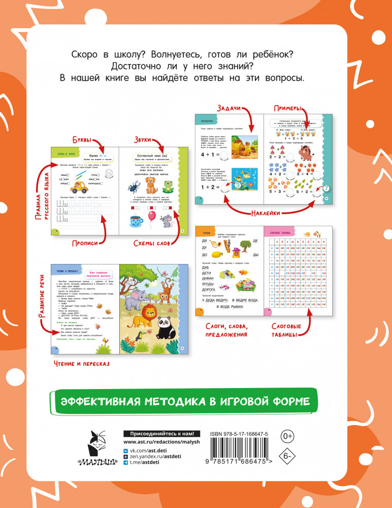 Годовой курс занятий для детей от 6 до 7 лет. 101 наклейкаВалентина Геннадьевна Дмитриева В данный момент этот товар отсутствует в продаже. Возможно, у нас найдется аналогичный или похожий товар здесь. Серия: Годовой курс занятий с наклейками Книга «Годовой курс занятий для детей от 6 до 7 лет. 101 наклейка» — отличный выбор заботливых родителей. Курс соответствует требованиям нового Федерального государственного образовательного стандарта дошкольного образования, поэтому гарантирует эффективное обучение и полноценное развитие ребёнка. Малыш потренируется писать, читать и пересказывать, пополнит словарный запас, освоит слоговые таблицы, поиграет в игры с буквами и звуками, познакомится с цифрами и математическими знаками, научится решать простые примеры и задачи. |