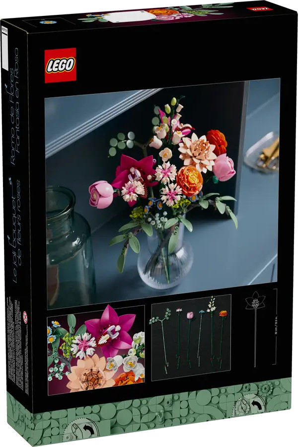 Начинающие флористы могут расслабиться и отдохнуть, собирая букет, состоящий из 15 цветочных стеблей LEGO, включая ромашки, васильки, эвкалипт, цветы бузины, розы, лютики, орхидеи цимбидиум, кувшинку, георгин и колокольчик. Все стебли регулируются, что позволяет строителям составить индивидуальный букет, который можно использовать в качестве цветочного декора дома или офиса. Для дополнительной персонализации цветы можно объединить с другими букетами LEGO, которые продаются отдельно, чтобы создать более крупную и уникальную цветочную композицию.