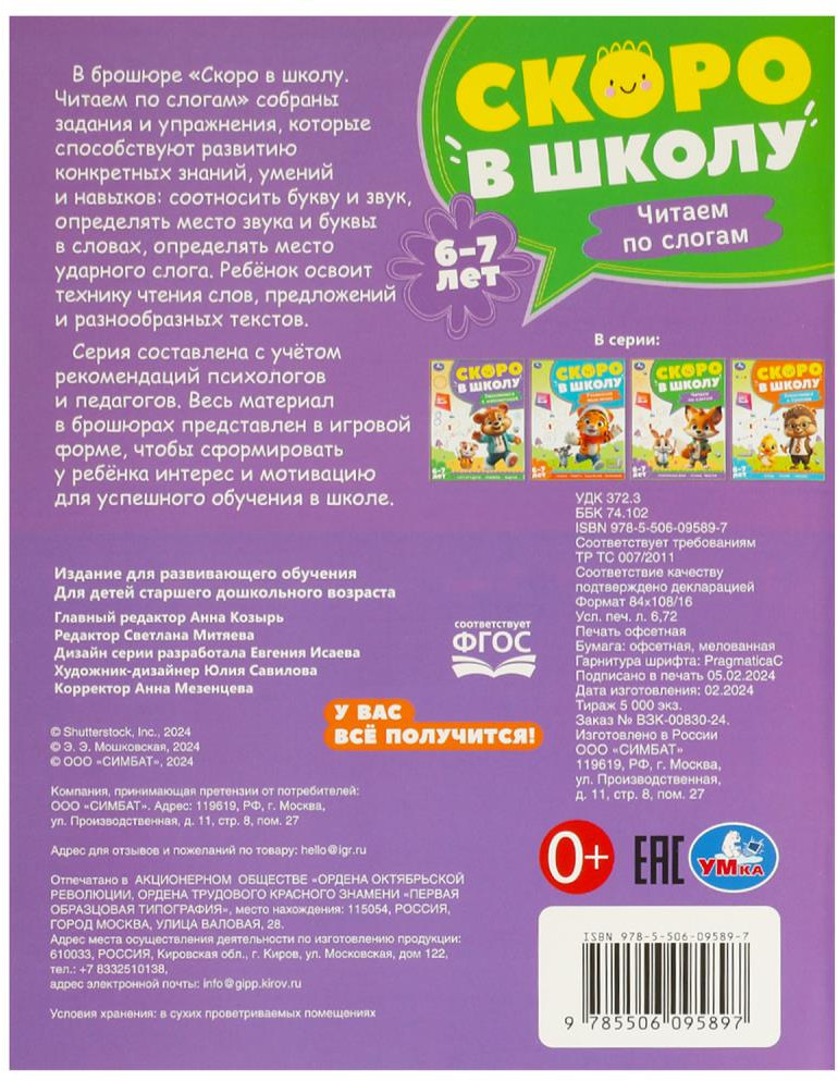 💳 Оплатить за товар можно при получении 🇰🇿 Есть бесплатная доставка по Казахстану 🎁 Копите бонусы с каждой покупки Брошюра для детей 6-7 лет «Чтение по слогам» из серии «Скоро в школу» ТМ «УМка» превратит обучение в увлекательную игру. |