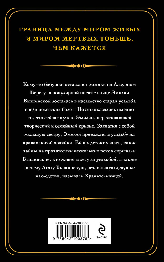 Серия: Мистические романы Натальи Тимошенко (обложка) Какие секреты есть в вашей семье? Таинственный клад, любовный треугольник или страшные гробы в фамильном склепе? Эмилии Вышинской неожиданно досталось наследство от незнакомой родственницы — банковский счет и огромная усадьба в глухой деревне. Девушка отправляется в новые владения вместе со своей сестрой Юлией. Но она даже не подозревает, какие тайны хранит этот старый дом. |