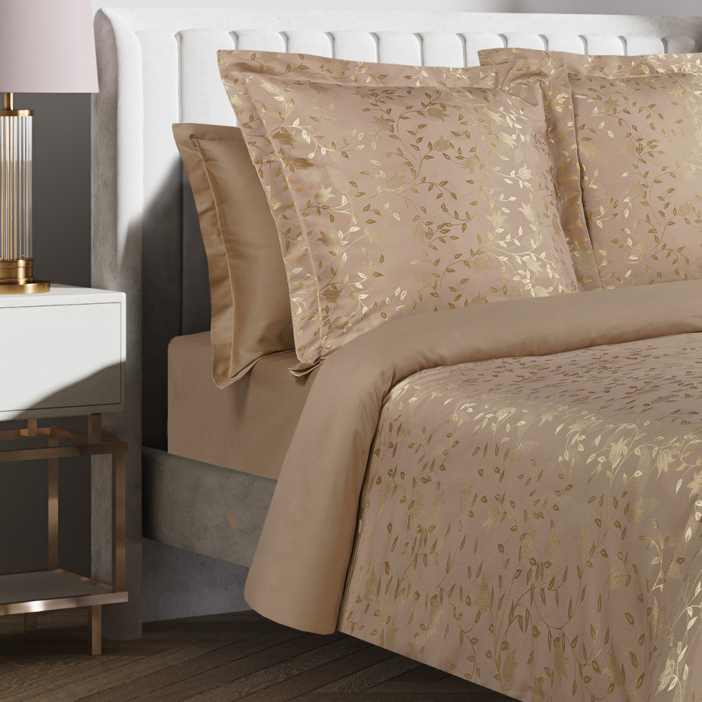 Наволочки комплекта украшены широкими декоративными воланами — «ушками», в пододеяльник вшита молния, это значительно облегчает заправку одеяла. Постельное белье изготовлено из гладкого шелковистого хлопка-сатина высокой плотности, это очень красивый и прочный материал. Ткань с сатиновым плетением не деформируется и не дает усадки, цвета этого постельного белья не поблекнут после многократных стирок. Изысканный дизайн, гармоничное сочетание жаккарда и гладкого сатина производят впечатление и рождают особенные эмоции, как и любая истинная красота.