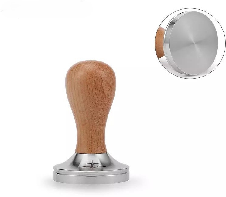 Классический темпер с деревянной ручкой. На основании темпера есть резьба, которая при темперовке образует рисунок на кофейной таблетке. |