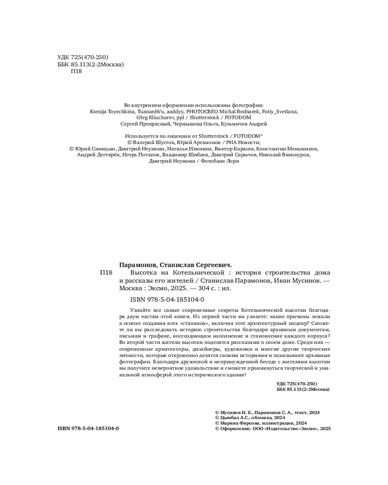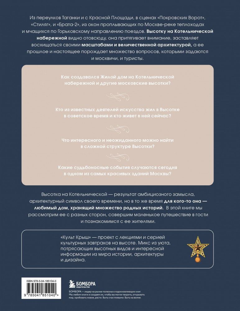 Серия: Культ крыш. Лекторий на высоте Уютная атмосфера, потрясающий высотный вид и увлекательная информация из мира истории, архитектуры и дизайна — все это собралось воедино в рамках проекта «Культ Крыш» в высотке на Котельнической набережной! Лекции с потрясающим видом на нашу столицу вдохновили авторов проекта рассказать подлинную историю одной из самых красивых сталинских высоток в мире, а также собрать всю уникальную информацию в одной книге — «Высотка на Котельнической. История строительства дома и рассказы его жителей»! |