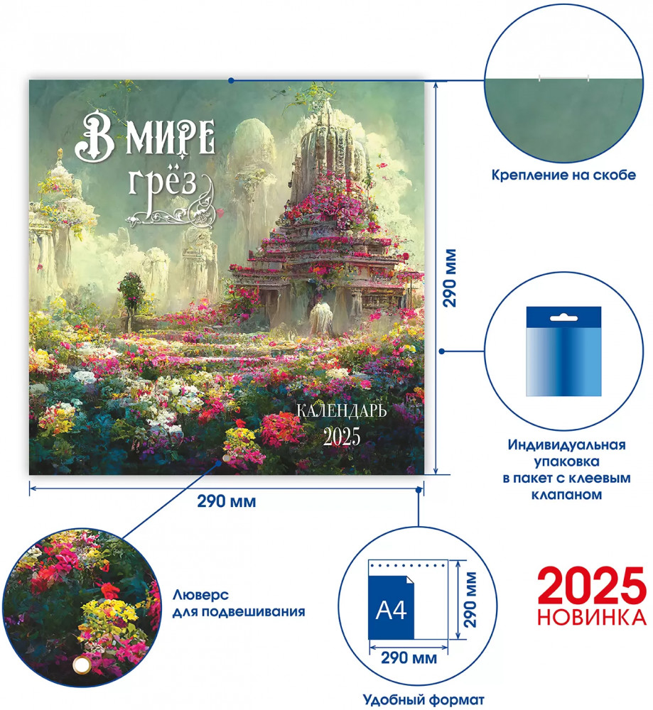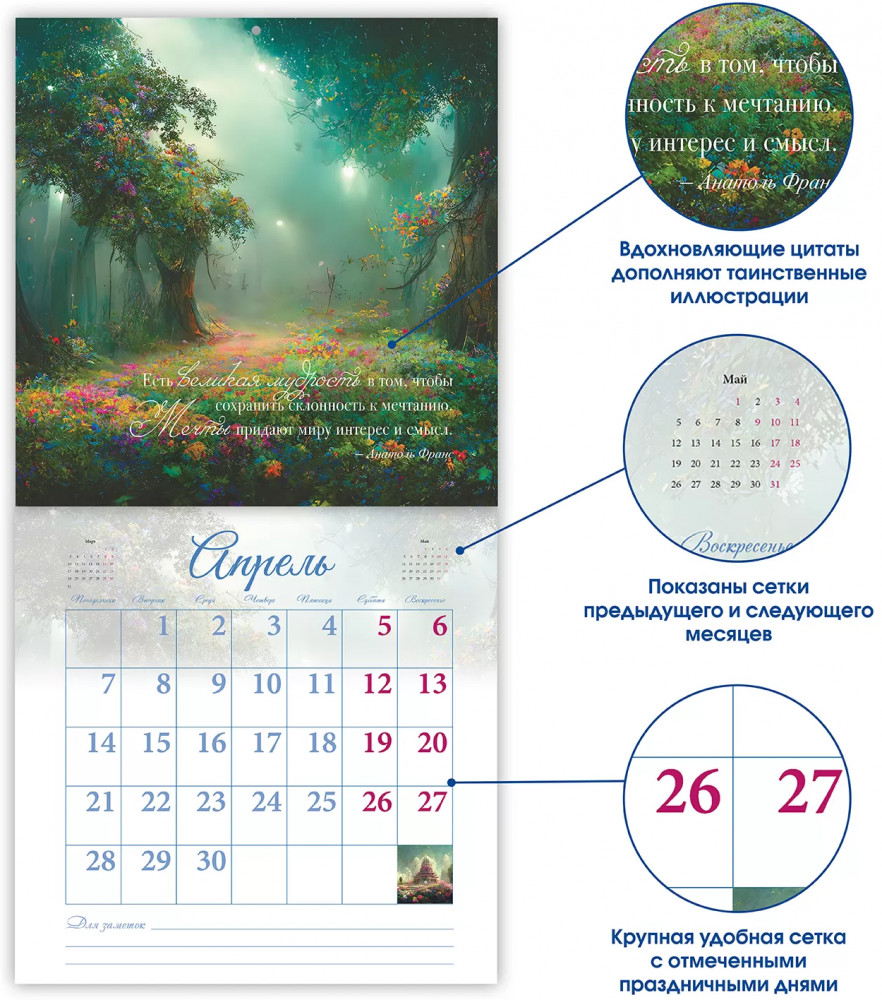 Оригинальный календарь с яркими иллюстрациями, созданными с помощью искусственного интеллекта, перенесет вас в волшебный мир грез. Сказочные изображения пробуждают воображение и напоминают нам о том, что в жизни всегда есть место чудесам! А вдохновляющие цитаты известных людей еще раз доказывают, что мечты сбываются. Главное – верить! На каждом развороте календаря для вашего удобства приведены сетки предыдущего и последующего месяцев, а также место для заметок. |