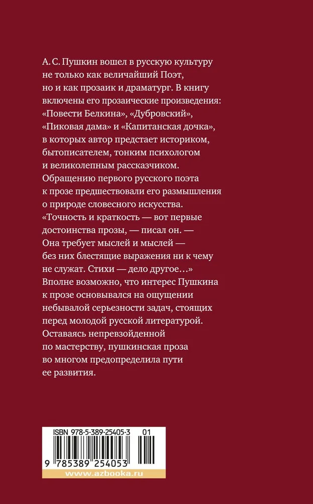 Серия: Родная классика А. С. Пушкин вошел в русскую культуру не только как величайший Поэт, но и как прозаик и драматург. В книгу включены его прозаические произведения: «Повести Белкина», «Дубровский», «Пиковая дама» и «Капитанская дочка», в которых автор предстает историком, бытописателем, тонким психологом и великолепным рассказчиком. Обращению первого русского поэта к прозе предшествовали его размышления о природе словесного искусства. «Точность и краткость — вот первые достоинства прозы, — писал он. — Она требует мыслей и мыслей — без них блестящие выражения ни к чему не служат. Стихи — дело другое...» Вполне возможно, что интерес Пушкина к прозе основывался на ощущении небывалой серьезности задач, стоящих перед молодой русской литературой. Оставаясь непревзойденной по мастерству, пушкинская проза во многом предопределила пути ее развития. |
