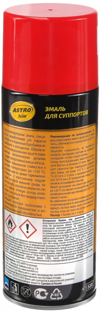 Краска-спрей для суппортов красная аэрозоль специально разработана для окраски суппортов и тормозных барабанов автомобилей и мотоциклов, поэтому устойчива к воздействию высоких температур (до +120°C), возникающих при торможении. Яркоокрашенные суппорты, пришедшие в повседневную реальность из гоночного мира, ассоциируются со спортивным характером автомобиля, который свойственен спорткарам. Но, в первую очередь, — это непревзойденный декоративный вид колес и эффектный облик всего автомобиля.