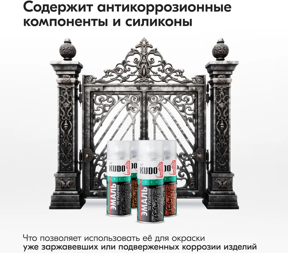Краска молотковая по ржавчине серебристо-коричневая — содержит в своем составе антикоррозионные компоненты и силиконы, что позволяет использовать её для окраски уже заржавевших или подверженных коррозии изделий из сплавов чёрных металлов, а также для декоративной окраски предварительно загрунтованных деревянных, пластиковых и других поверхностей.