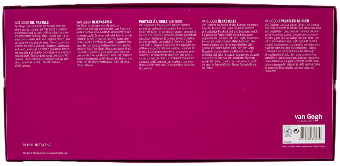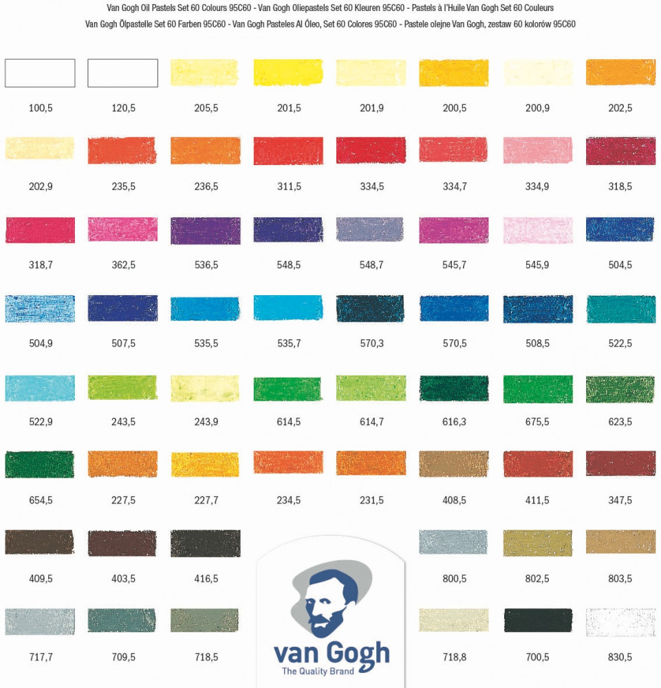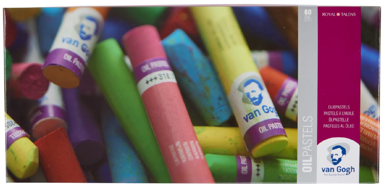 Масляная пастель «Van Gogh» изготавливается из светостойких пигментов и связующего на основе жиров и воска. Хорошо ложится на различные материалы (бумага, картон, холст, дерево). Не высыхает и не теряет свой цвет с течением времени. Подходит для использования в различных техниках. В палитре представлено 60 различных цветов. Выпускается поштучно и в наборах с разным количеством цветов.