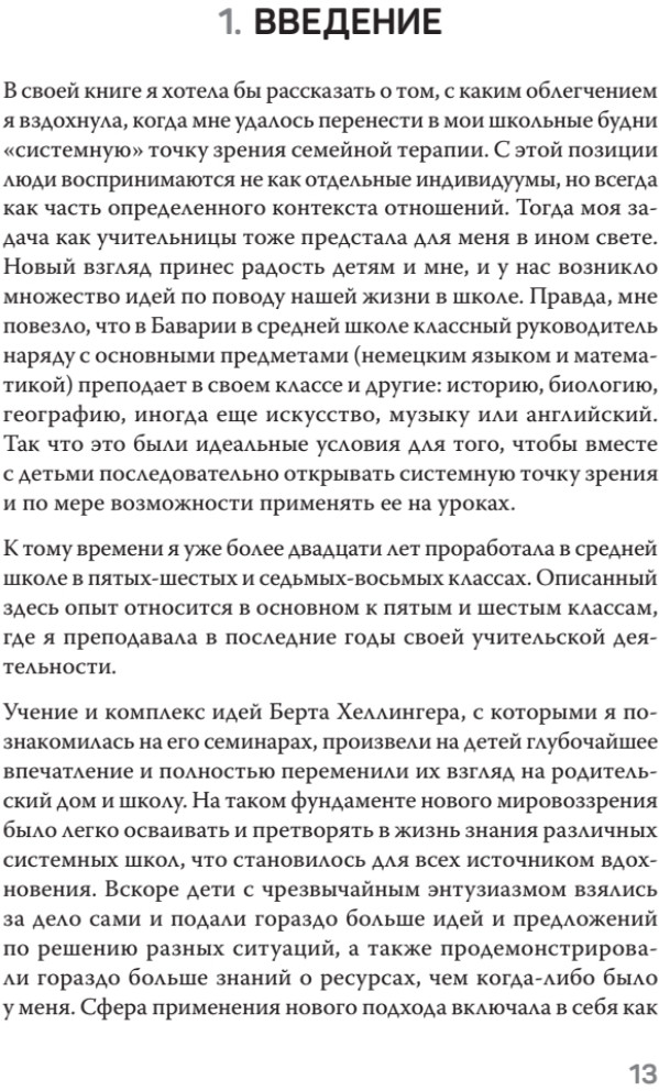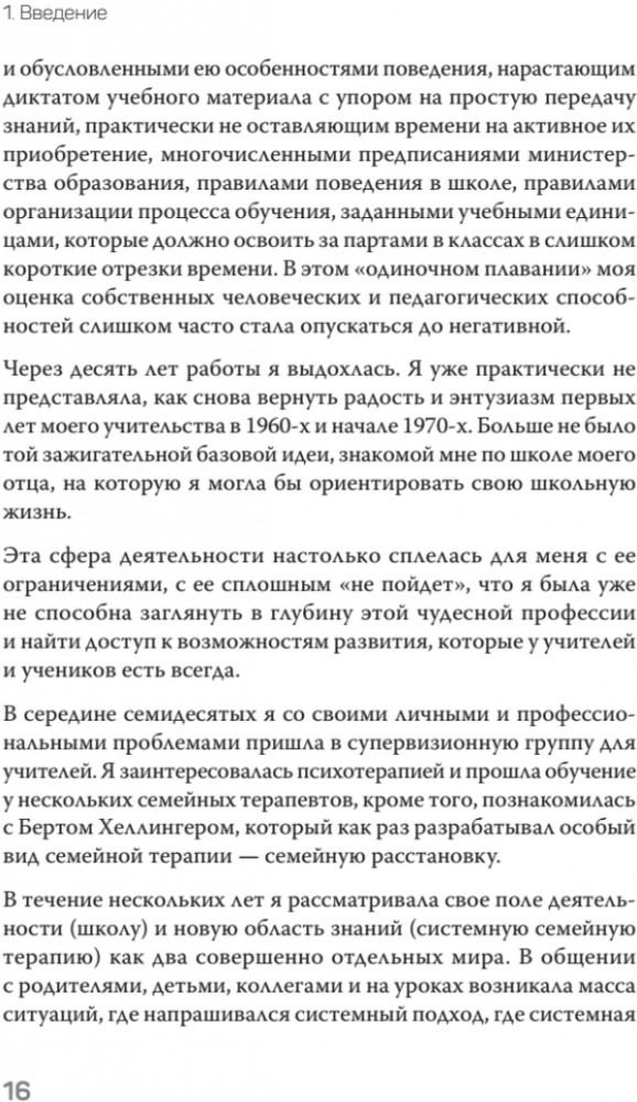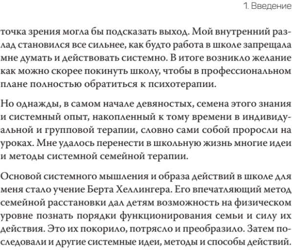 Эта книга — увлекательный рассказ школьной учительницы и психотерапевта о том, как системные идеи открывают возможность для принципиально новой и продуктивной учебы и способствуют творческому сотрудничеству учеников, учителей и родителей. В своей работе автор сочетает подходы различных системных направлений с идеями Берта Хеллингера о силе привязанности к родной семье. Ее рассказ иллюстрируется практическими примерами из школьной жизни, демонстрирующими, как системное мышление влияет на возможность позитивных перемен даже в самых трудных ситуациях. |