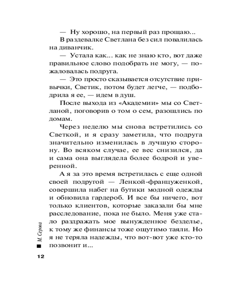 | Марина Сергеевна Серова — один из ведущих авторов серии современного русского детективного жанра (существует версия, что это коллектив авторов под общим руководством литературного агента Сергея Потапова). Согласно легенде, «выпускница юридического факультета МГУ, работала в Генеральной прокуратуре, сотрудница одной из спецслужб, участвовала в боевых операциях». Между тем написала 425 произведений размером порядка 200 страниц (и число их постоянно увеличивается). Часть произведений... |