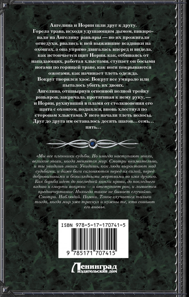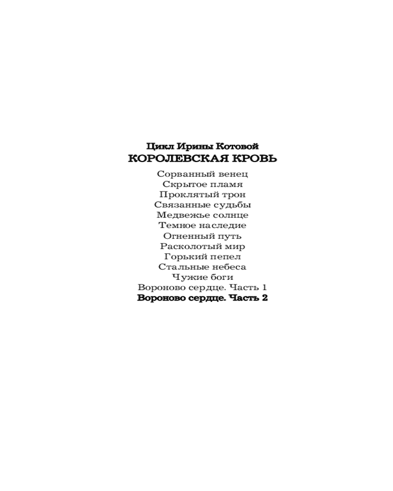 Королевская кровь. Вороново сердце. Часть 2В данный момент этот товар отсутствует в продаже. Возможно, у нас найдется аналогичный или похожий товар здесь. Серия: Другие миры «Мы все пленники судьбы. Но иногда наступают эпохи, ве- ликие эпохи, когда меняется мир. Смотри внимательно, и ты увидишь знаки. Увидишь, как люди вырастают над судьбами, и даже боги склоняются перед их силой, перед добровольны- ми и безоглядными жертвами во имя другого. Как борьба идет до последней капли крови, до последнего вздоха и смерти во- преки — и отступает рок, и ломается предначертание. Никог- да такое не бывает случайно. Смотри. Наблюдай. Помни. Такое случается только тогда, когда мир уже треснул и нужны те, кто сошьют его вновь». |