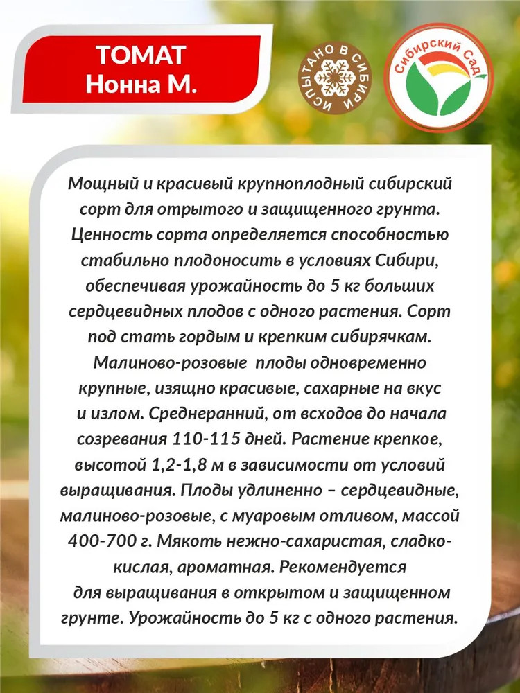 Мощный и красивый крупноплодный сибирский сорт для отрытого и защищенного грунта. Ценность сорта определяется способностью стабильно плодоносить в условиях Сибири, обеспечивая урожайность до 5 кг больших сердцевидных плодов с одного растения. Сорт под стать гордым и крепким сибирячкам. Малиново-розовые плоды одновременно крупные, изящно красивые, сахарные на вкус и излом. Среднеранний, от всходов до начала созревания 110-115 дней. Растение крепкое, высотой 1.2-1.8 м в зависимости от условий выращивания. Плоды удлиненно — сердцевидные, малиново-розовые, с муаровым отливом, массой 400-700 г. Мякоть нежно-сахаристая, сладко-кислая, ароматная. Рекомендуется для выращивания в открытом и защищенном грунте. Урожайность до 5 кг с одного растения. |