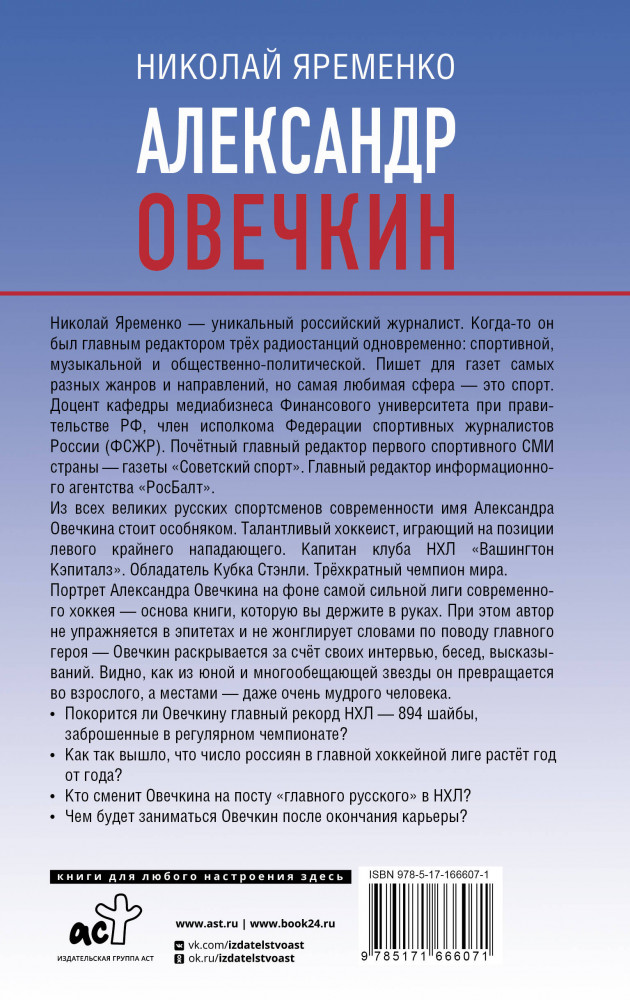 Серия: Звезды спорта Николай Яременко — уникальный российский журналист. Когда-то он был главным редактором трёх радиостанций одновременно: спортивной, музыкальной и общественно-политической. Пишет для газет самых разных жанров и направлений, но самая любимая сфера — это спорт. Доцент Кафедры медиабизнеса Финансового университета при правительстве РФ, член исполкома Федерации спортивных журналистов России (ФСЖР). Почётный главный редактор первого спортивного СМИ страны — газеты «Советский спорт». Главный редактор информационного агентства «РосБалт». |