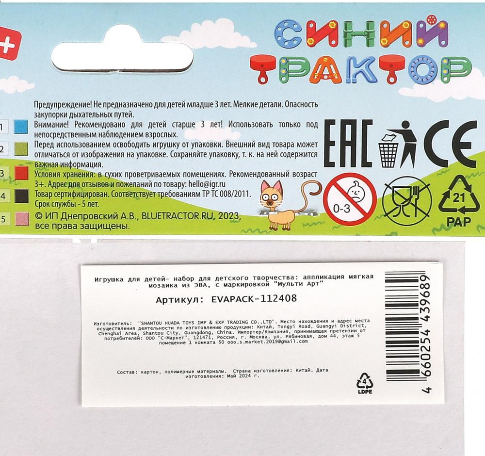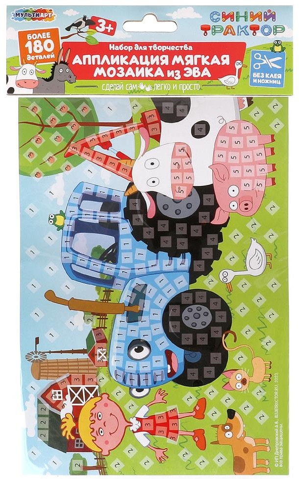 Серия: Синий трактор Набор для творчества — мягкая мозаика из ЭВА серии «Синий Трактор» ТМ «Мульти Арт» — отличный подарок для ребёнка, который будет способствовать развитию его творческих способностей. С помощью красочной основы и разноцветных деталей из мягкого материала маленький любознайка сможет самостоятельно создать яркую аппликацию с изображением персонажей любимого мультсериала. Готовая поделка станет отличным вариантом для подарка близким или для украшения детской комнаты. Занятия с наборами для творчества ТМ «Мульти Арт» развивают: внимание и усидчивость, творческое мышление, сенсорное и цветовое восприятие, моторику рук и воображение. |