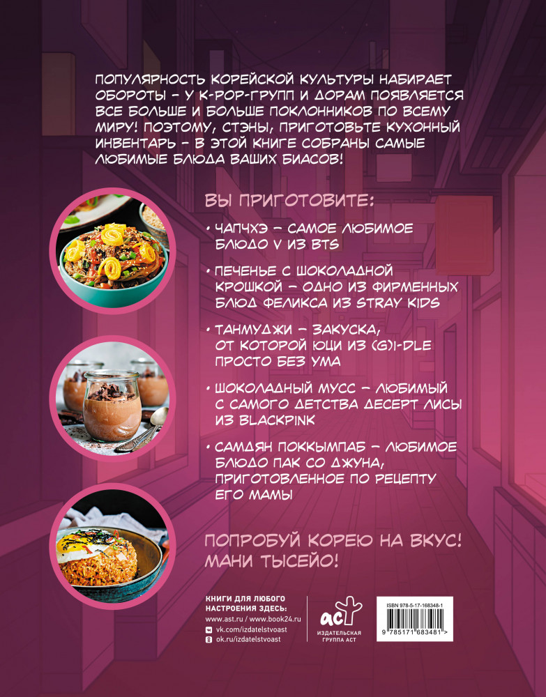 Серия: ХЗ: Хлеба и зрелищ Популярность корейской культуры набирает обороты — у k-pop групп и дорам появляется все больше и больше поклонников по всему миру! Поэтому стэны, приготовьте кухонный инвентарь — в этой книге собраны самые любимые блюда ваших биасов! |