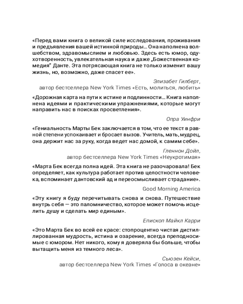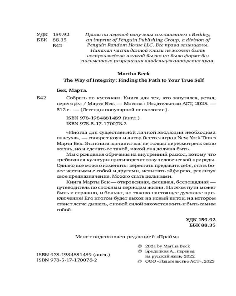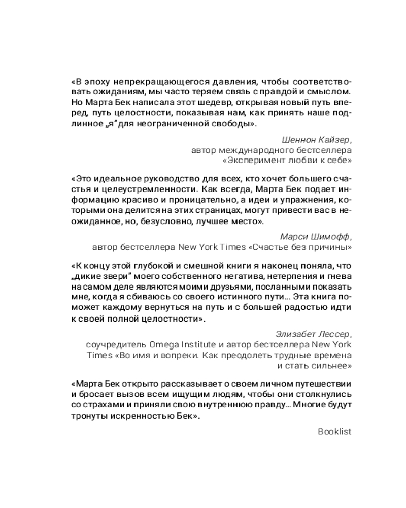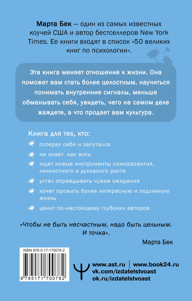 💳 Оплатить за товар можно при получении 🇰🇿 Есть бесплатная доставка по Казахстану 🎁 Копите бонусы с каждой покупки Серия: Легенды популярной психологии Почему вы страдаете, зачем общаетесь с неприятными людьми, сохраняете травмирующие отношения, а в минуты отчаянья хватаетесь за негативные привычки? Всё просто — вы потеряли себя. Это не вы, а некий образцовый гражданин, которого хотят видеть родители, супруги, работодатели, друзья. Марта Бек — один из самых известных коучей США и автор бестселлеров New York Times, ее книги входят в список «50 великих книг по психологии» — поможет вам стать более целостным, начать жить своей жизнью и перестать предавать себя. |