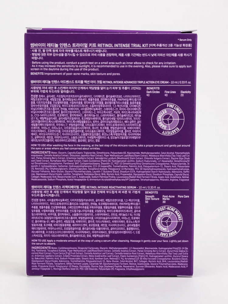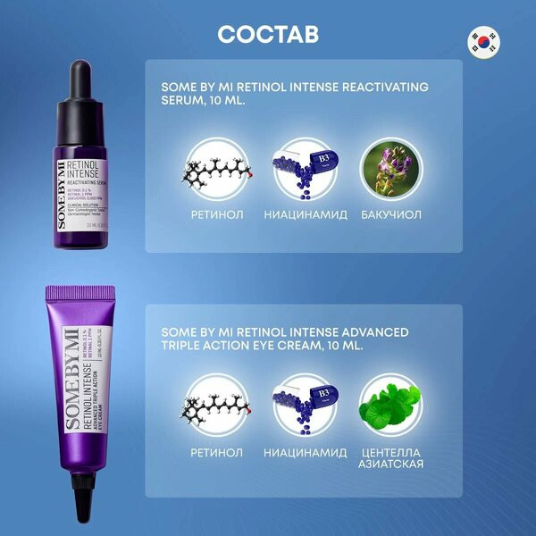 Сыворотка: Water, Cyclohexasiloxane, Dicaprylyl Carbonate, Glycerin, Methylpropanediol, 1,2-Hexanediol, Niacinamide, Hydrogenated Poly(C6-14 Olefin), Panthenol, Tocopheryl Acetate, Piper Methysticum Leaf/Root/Stem Extract, Centella Asiatica Extract, Panax Ginseng Berry Extract, Glycyrrhiza Glabra (Licorice) Root Extract, Ficus Carica (Fig) Fruit Extract, Centella Asiatica Leaf Extract, Centella Asiatica Root Extract, Melaleuca Alternifolia (Tea Tree) Leaf Extract, Artemisia Capillaris Extract, Eclipta Prostrata Extract, Melia Azadirachta Leaf Extract, Elaeis Guineensis (Palm) Oil, Hydrogenated Lecithin, Glyceryl Stearate, Bakuchiol, Palmitic Acid, Sodium Polyacrylate, Stearic Acid, Xanthan Gum, Retinol (0.1 %), Acrylates/C10-30 Alkyl Acrylate Crosspolymer, Butylene Glycol, Dipotassium Glycyrrhizate, Adenosine, Tromethamine, Polyquaternium-51, Beta-Glucan, Cetyl Alcohol, BHT, Collagen, Myristic Acid, BHA, Leuconostoc/Radish Root Ferment Filtrate, Tocopherol, Bifida Ferment Lysate, Ceramide NP, Saccharomyces Ferment, Retinal, Asiaticoside, Glyceryl Polymethacrylate, Madecassoside, Propylene Glycol, Polyglyceryl-10 Oleate, Glycolipids, Glycine Soja (Soybean) Peptide, Resveratrol, Sucrose Distearate, Asiatic Acid, Madecassic Acid, Palmitoyl Tripeptide-1, Moringa Oleifera Seed Oil, PEG-100 Stearate, Polysorbate 20, Fragrance, Ethylhexylglycerin.