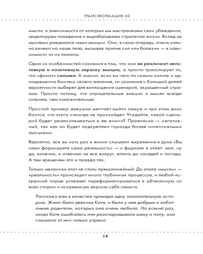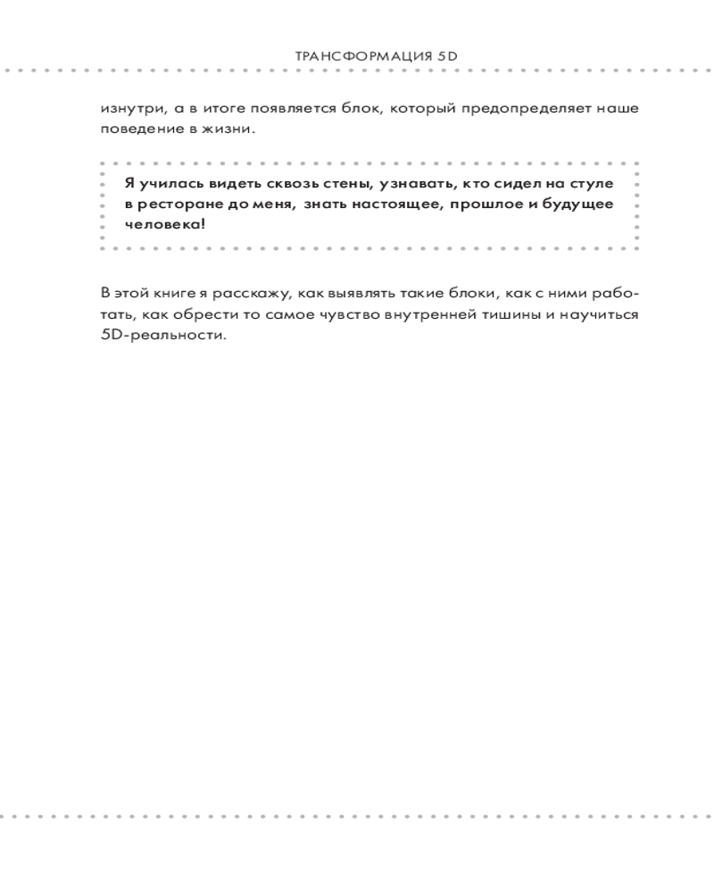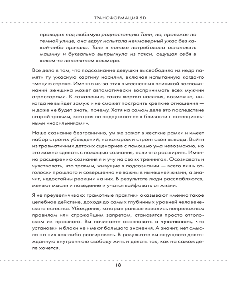 Серия: Драйверы счастья Что такое Трансформация 5D? Когда мы начинаем по-настоящему меняться и видеть истинных себя? Выходить из замкнутого круга травм и проблем, открывая свою суперсилу и чувствуя настоящий экстаз существования? Книга Дарьи Каболовой, учителя и целителя медитативного йоговского искусства Сат Нам Расаян с 28-летним опытом — об этом. Она о том, как наш ум стремительно трансформируется, когда отпускает привычные установки, когда мы позволяем себе выйти за рамки стереотипного мышления и создаем свой путь жизни без рамок и навязанных нам родовых программ. |