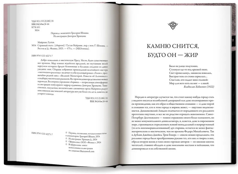 Серия: NEOготика Добро пожаловать в мистическую Прагу. Место, будто существующее вне времени. Мир темных иудейских преданий, по окутанным мглой переулкам которого бродят безымянные и безликие создания из давно ушедших эпох. Сборник избранных произведений величайшего мастера «магического реализма» включает в себя культовый роман «Голем», чрезвычайно редкий цикл «Великий Магистерий. Повести об Алхимиках» и подборку мистических рассказов. Все произведения представлены в новых переводах. Бесспорное украшение сборника — потрясающие атмосферные иллюстрации популярного хоррор-художника Дмитрия Храмцова. Таинственная, оккультная, восхитительно лаконичная проза Майринка радует поклонников мистической литературы вот уже более ста лет и, кажется, не устареет никогда. |