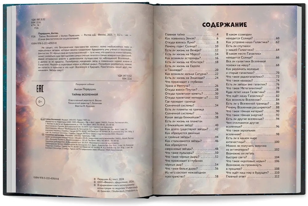 💳 Оплатить за товар можно при получении 🇰🇿 Есть бесплатная доставка по Казахстану 🎁 Копите бонусы с каждой покупки Серия: Самая фантастическая энциклопедия Не секрет, что безграничное пространство космоса полно необъяснимых тайн и нерешённых загадок, которые веками продолжают будоражить умы учёных и писателей-фантастов. От чёрных дыр до мультивселенной — та истина, что кроется за этими тайнами, может оказаться куда причудливее самых смелых гипотез и самых невероятных фантазий. Давай отправимся вместе в удивительное путешествие по наблюдаемой Вселенной... и далеко за её пределы. Полюбуемся рождением звёзд и появлением первой жизни в Галактике. Нырнём в «кротовые норы» и «белые дыры». Попробуем разобраться, можно ли попасть в прошлое и что ждёт Вселенную в будущем. Пристегнись, юный друг, мы начинаем. Звёзды зовут! |