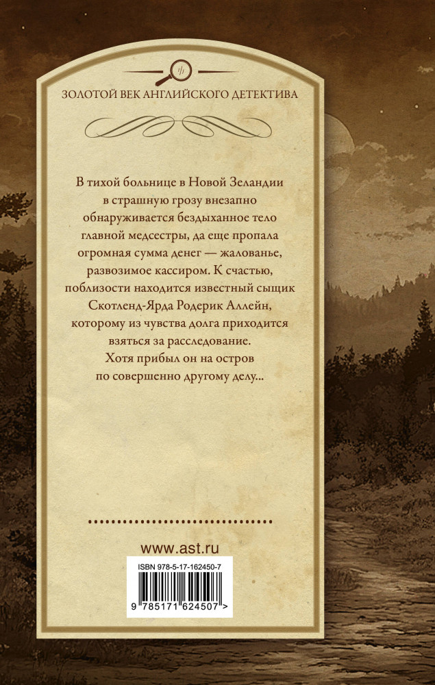 В данный момент этот товар отсутствует в продаже. Возможно, у нас найдется аналогичный или похожий товар здесь. Серия: Золотой век английского детектива В тихой больнице в Новой Зеландии в страшную грозу внезапно обнаруживается бездыханное тело главной медсестры, да еще пропала огромная сумма денег — жалованье, развозимое кассиром. К счастью, поблизости находится известный сыщик Скотленд-Ярда Родерик Аллейн, которому из чувства долга приходится взяться за расследование.